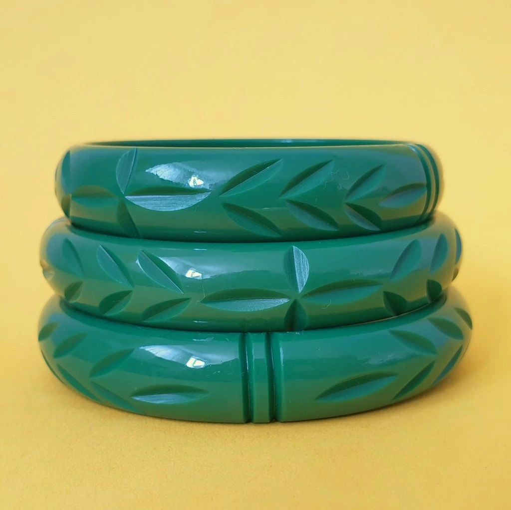 Based on vintage designs for that authentic look, the fabulous carved fakelite Elsie bangle in Green!