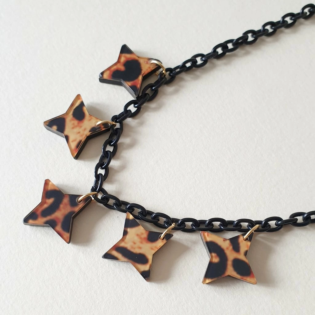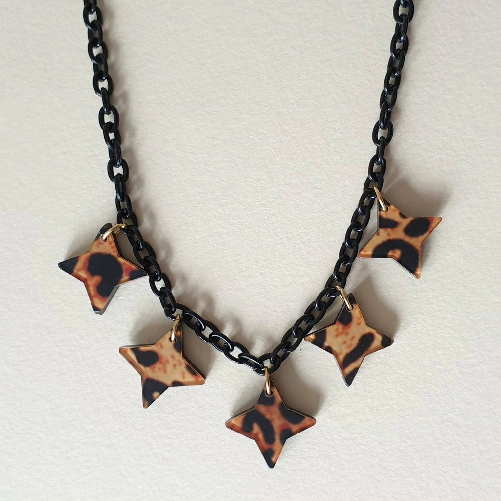 Sparkle the fabulous 50’s with our Leopard Print Lola Starburst Necklace. Atomic star charms measuring approx 2.3cm x 2.3cm crafted in modern resin set with Leopard Print for some feline flair.