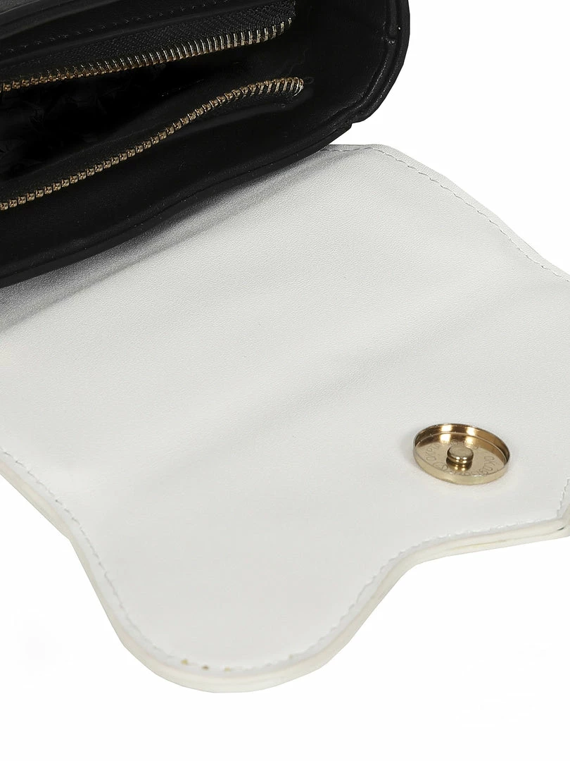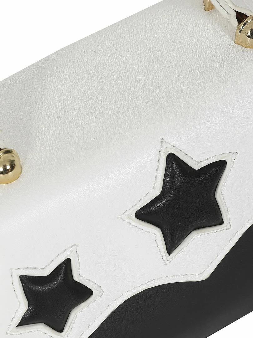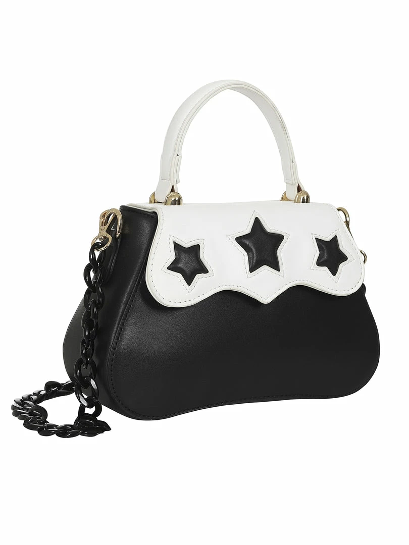 We’ve gone all starry-eyed over our Sonia Star Bag! She’s a monochromatic style, coming in black with a white, western-style fold-over flap, which features three padded black stars. She’s made from soft PU and has brass coloured metal fastenings. She fastens via a popper button on the flap and a zipper underneath. Her black, metal chain shoulder strap is removable, and she has a white PU top handle as well.