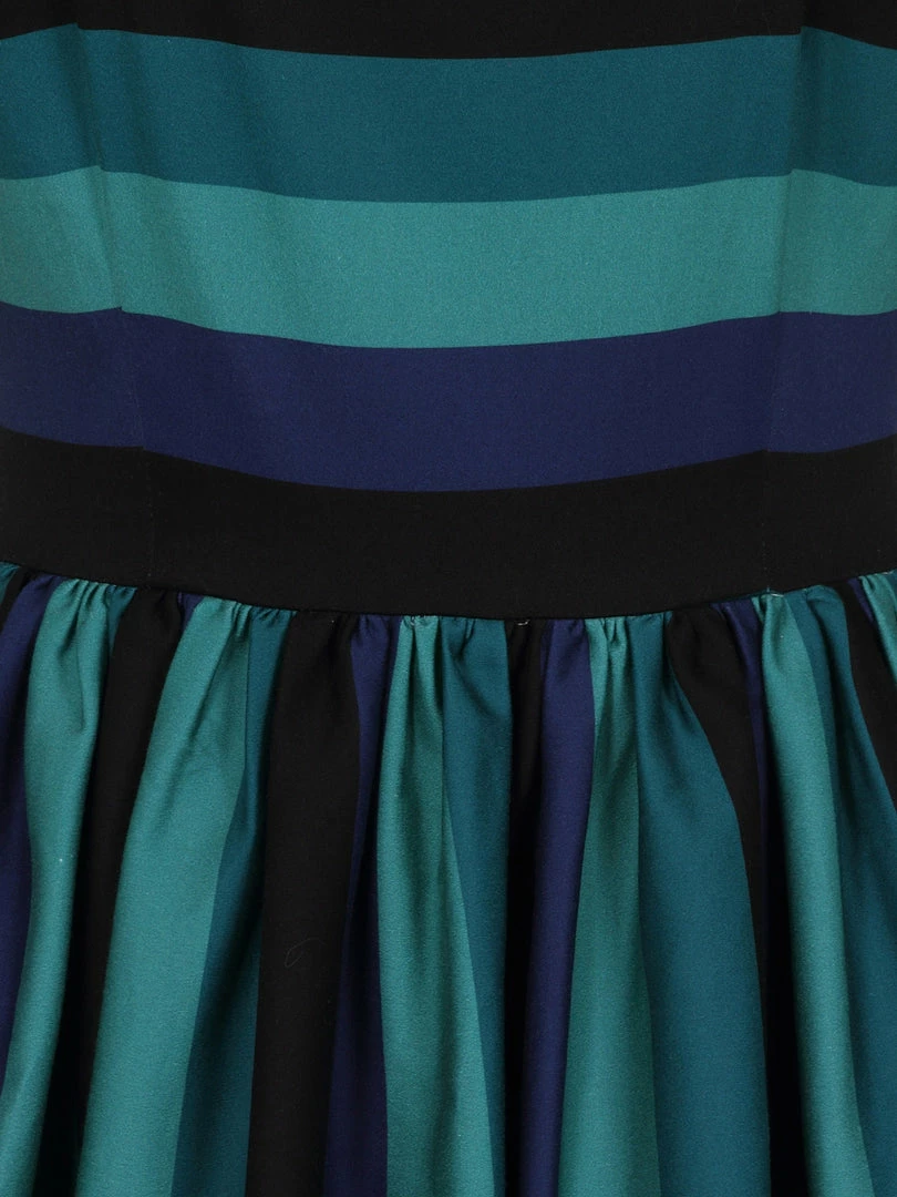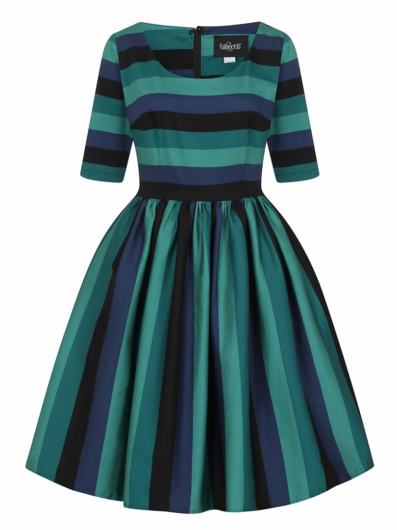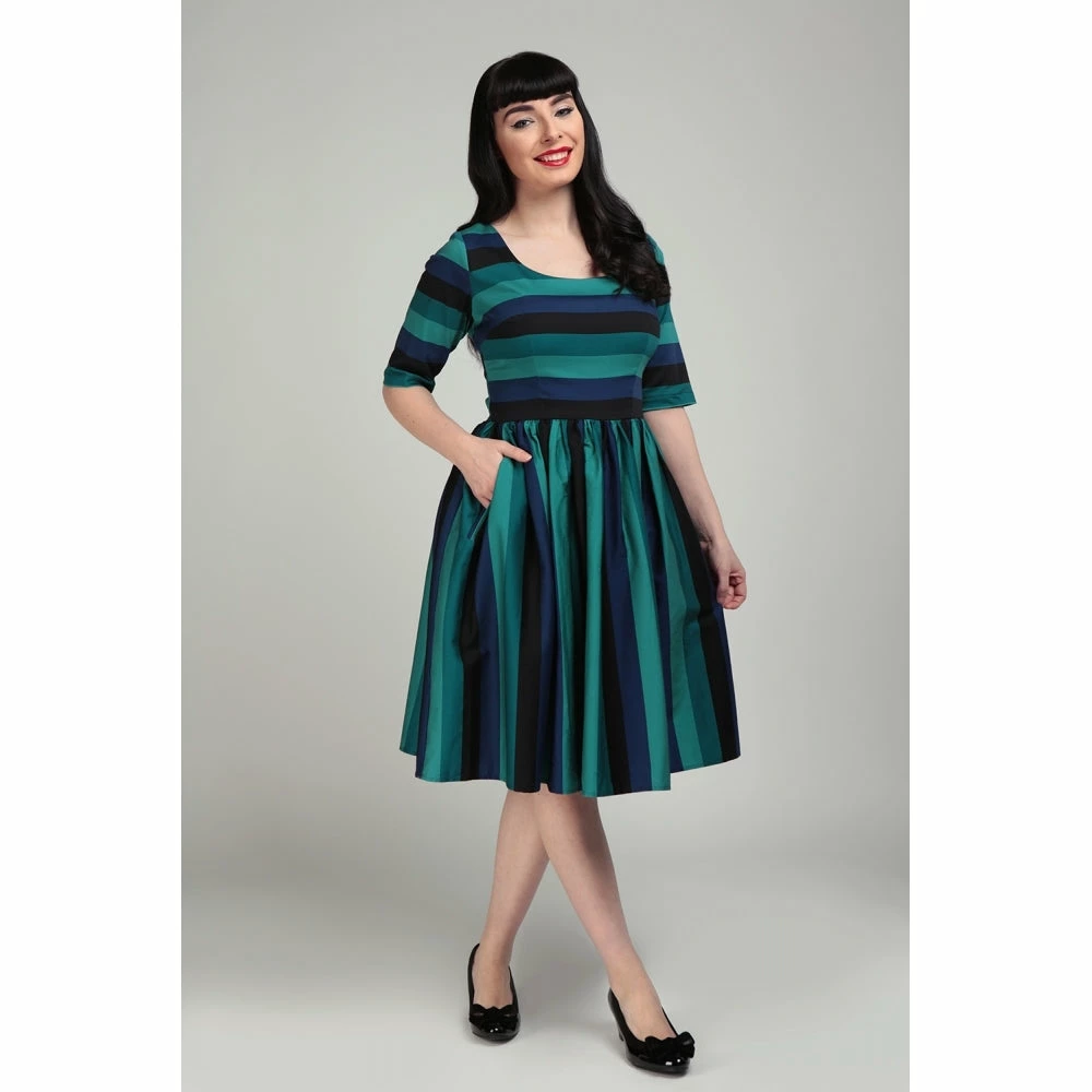 Swing-step into the twilight with the Amber-Lea Twilight Stripe Swing Dress. Made from cotton sateen, she has a fitted bodice with a scooped neckline and elbow length sleeves. Her skirt is gathered at the waist, flowing down roughly to just below the knee. She fastens with a covered zipper that runs down the back ,and her skirt even has pockets ! This classic style features our vintage inspired, bespoke print of dark, muted greens and blues perfect for Winter. Wear her on a casual day out or an evening of dancing, pairing her with pearls or a stack of bangles.