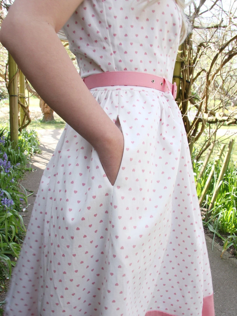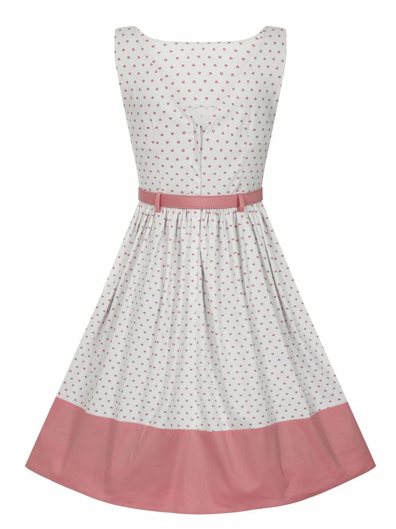 This pretty piece is our Brielle Love Heart Swing Dress – a cute, mid-century inspired style that just needs to be part of your collection! She’s fitted on the body with a boat neck that dips into a V at the back. Her skirt is gathered at the waist, and falls to approximately below the knee with a pink panel at the hem. She even has handy side seam pockets! She comes in white, and is covered in our bespoke print of adorable pink love hearts! She includes a pink belt to cinch in the waist, and she fastens via a covered zipper at the middle of her back.