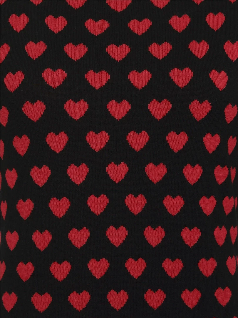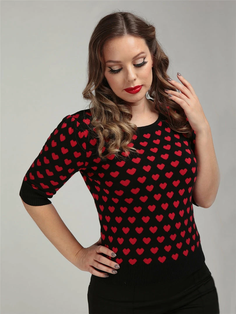 Feel the love this season with our Chrissie Heart Knitted Top! Chrissie is made from a gorgeous stretch cotton knit in black with a bespoke pattern of little red hearts all-over. She cuts off approximately at the upper hip, and features a round neckline and elbow-length sleeves with slightly puffed shoulders.Â