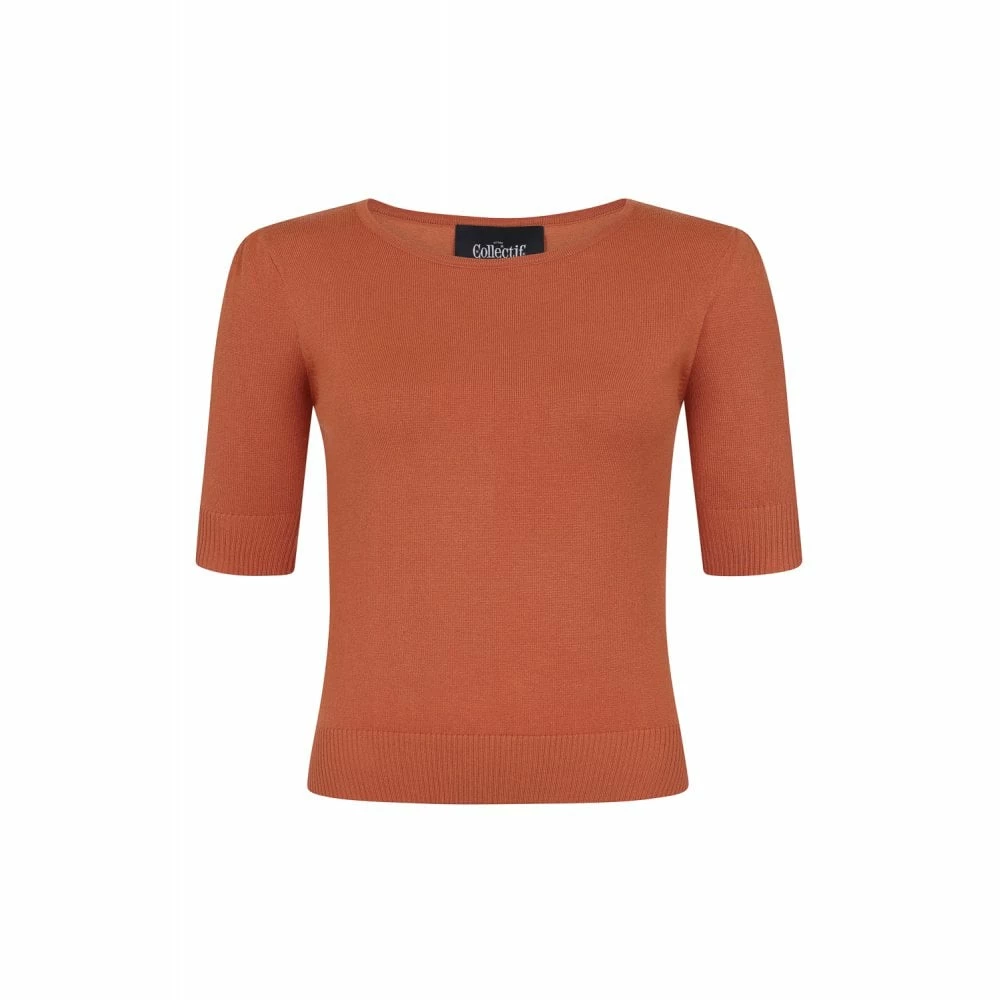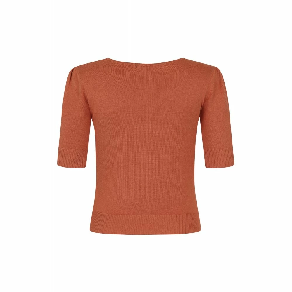 The Chrissie Plain Knitted Top is a fabulous 50s inspired piece. She is a hip length top, with elbow length puffed sleeves, and a round neckline. Made from a soft yarn, Chrissie is a lightweight knitted top in this lovely burnt orange. Chrissie pairs perfectly with the Poppy Jacket and matching Victoria Trousers or with the delightful Marilu Leaves Border Print Skirt.