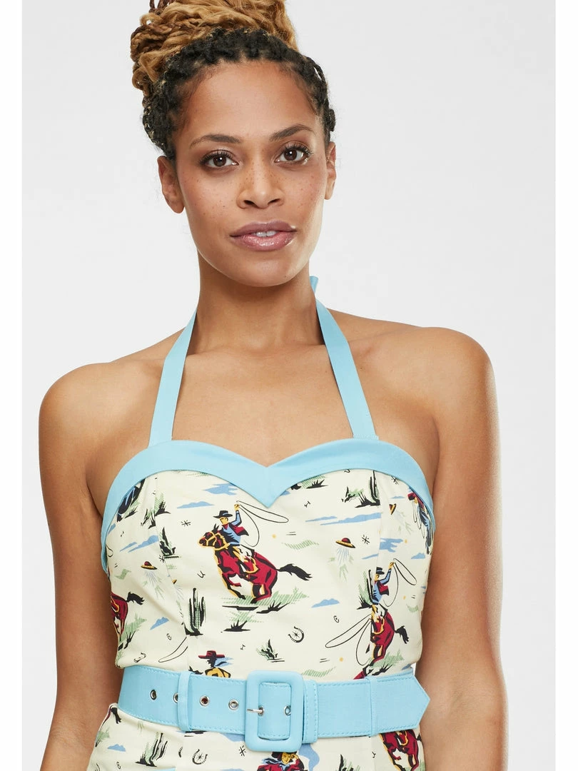 We are giddy for Georgie. This fabulous Rodeo Dancer Pencil Dress has a bespoke western-style print featuring cowgirls and boys out on the ranch, but what’s that flying above? This classic pencil dress has a halter neck tie to her sweetheart neckline and cute front pockets all finished in a beautiful blue. She is finished with a matching blue belt to complete her look.