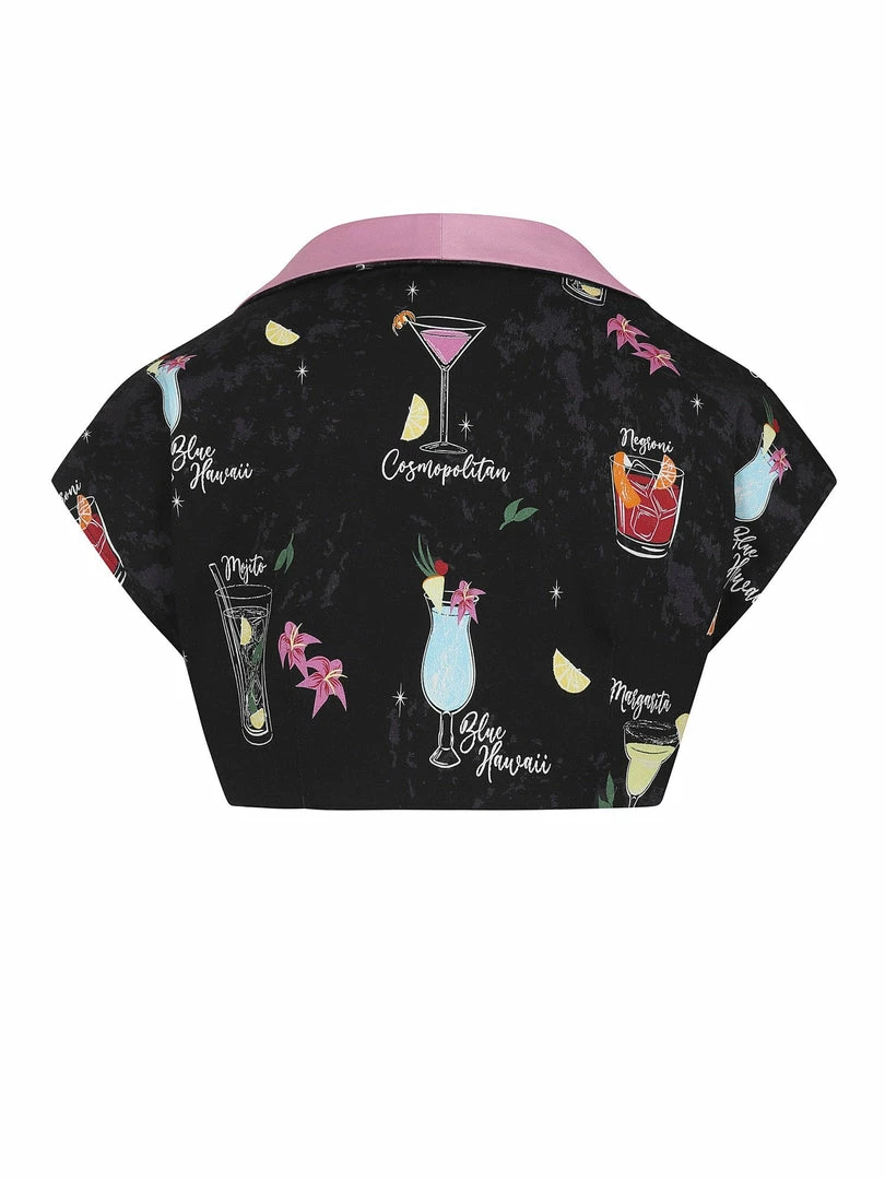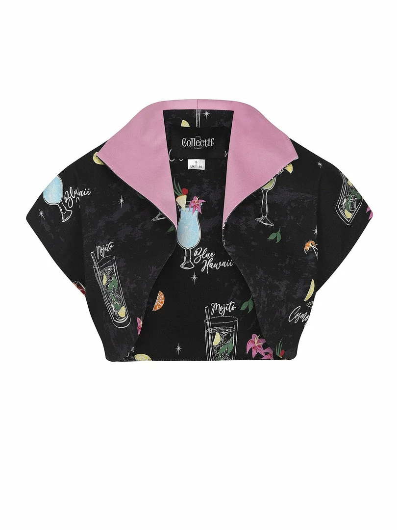 Shake up your style with the Lorna Cocktail Menu Bolero! She’s a cropped style that’s made from a cotton sateen fabric, featuring a bespoke print of thirst-quenching cocktails. Her large, bright pink pointed collar is sure to make a statement, and she has short sleeves that are perfect for wearing with sleeveless dresses. We think she looks great with the matching Lorna Cocktail Menu Pencil Dress!