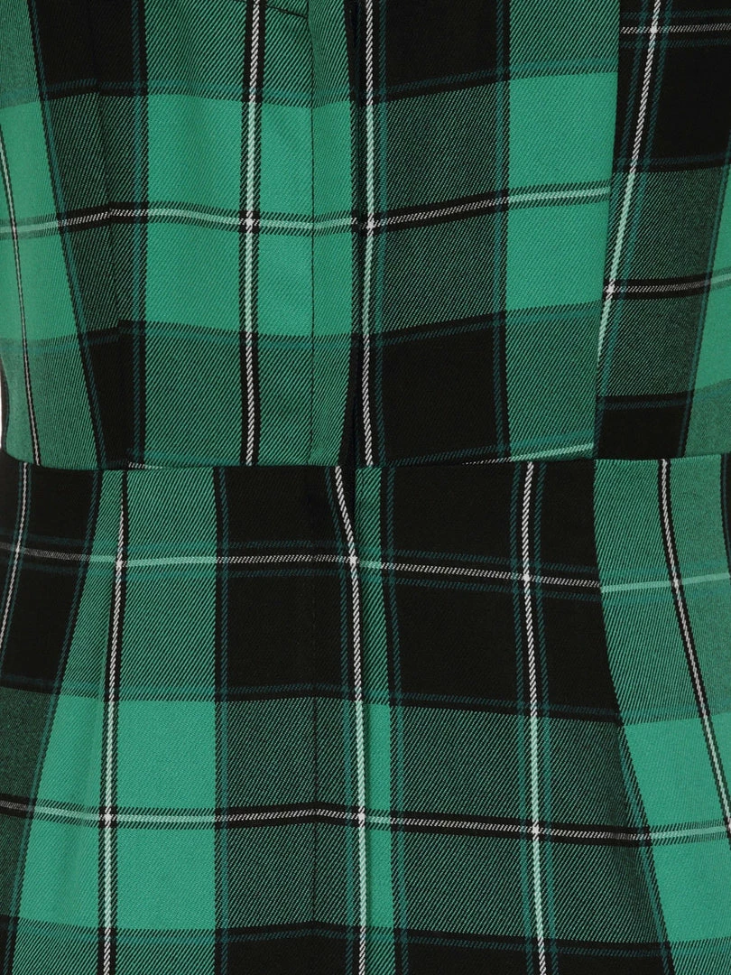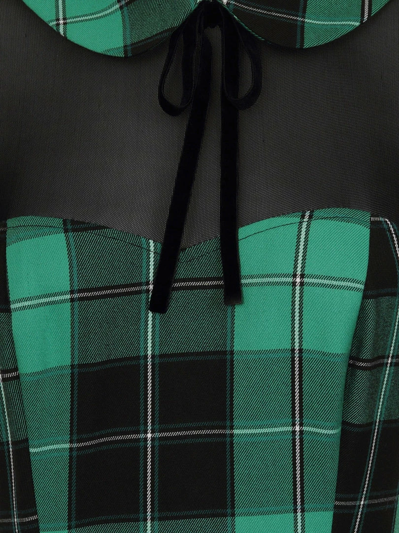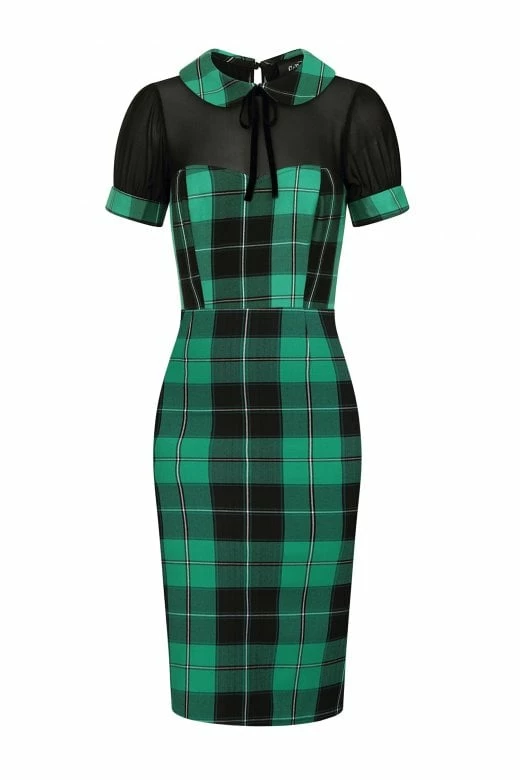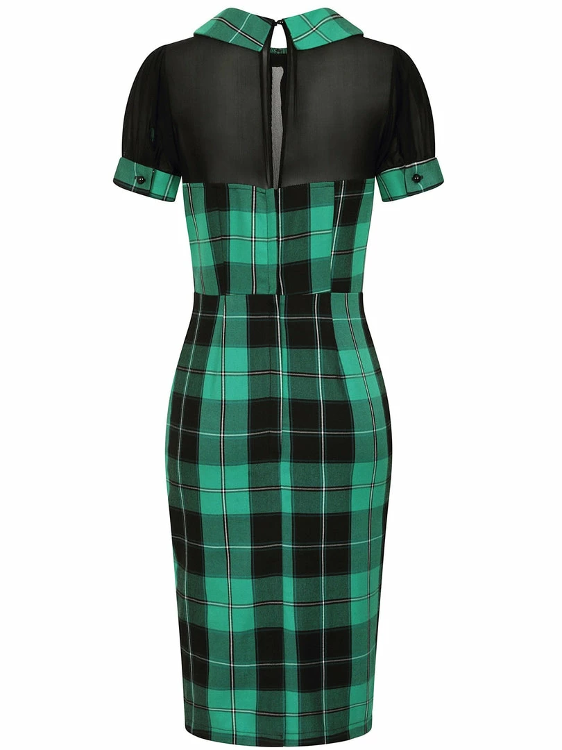 You’ll want to check out this new beauty! The Mac Foliage Check Pencil Dress comes in a delightful bespoke print of jade green and black check, making her perfect for Autumn, but versatile enough to wear in any season! She is a classic pencil shape ending approximately on the knee, and she features an elegant black mesh over the top of the bodice, finishing in an adorable Peter Pan collar with a black velvet tie. Her back features a cheeky keyhole in the mesh, and she fastens with a zip at the waist. Her short sleeves are puffed and end in gorgeous matching check cuffs with black mushroom buttons.Â
