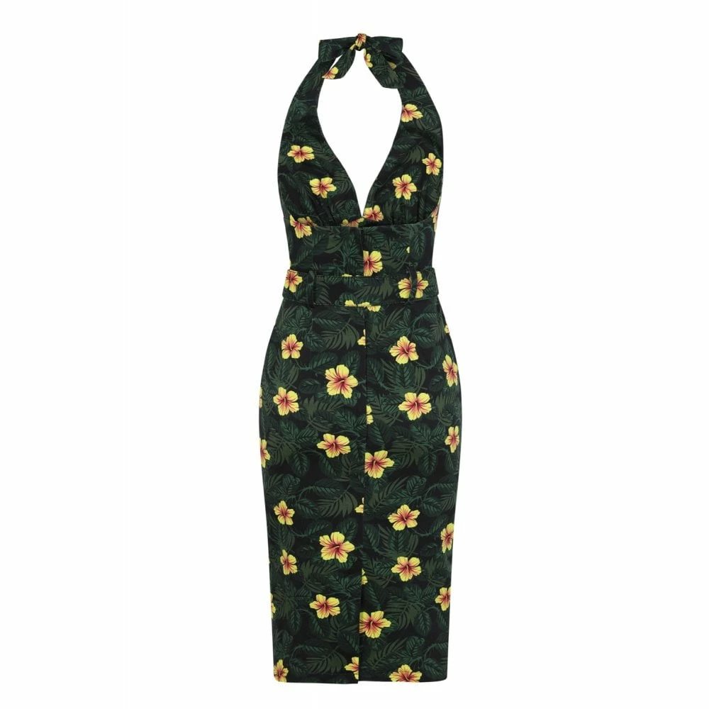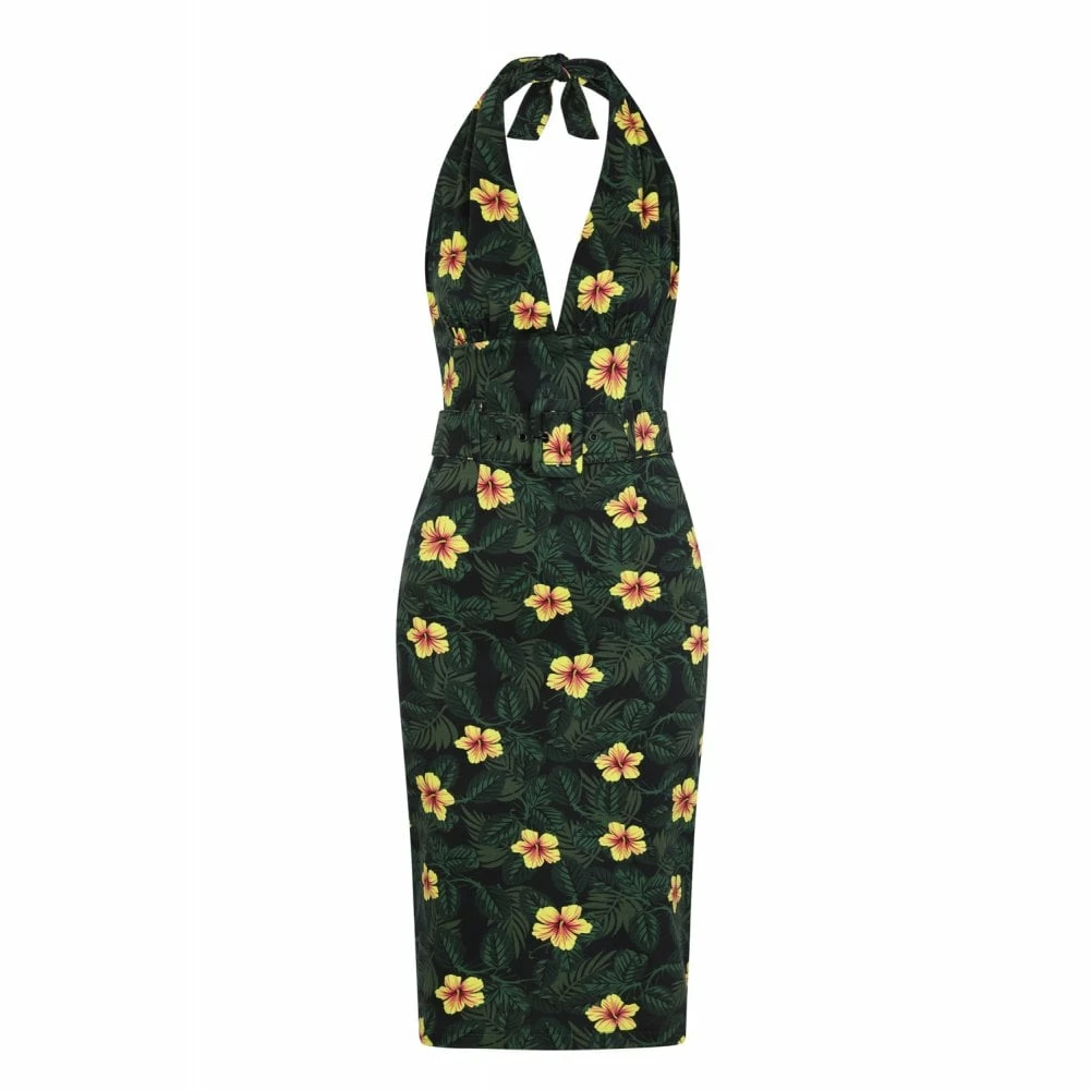Our Ramona Tropical Hibiscus Pencil Dress will transport you to a warmer climate! She is a classic rockabilly-inspired shape, with her shaped halter neck straps, and fitted wiggle shape through the body to her hem. She fastens with a centre back zip, and has a hem vent for ease of movement. Her wide waist belt is made from matching fabric for a vintage look, with metal eyelets and spoke, and backed with sturdy PU – perfect to emphasise your waist. Ramona is available in our Tropical Hibiscus fabric, a bespoke cotton sateen with beautiful yellow hibiscus flowers and green tropical leaves on a black ground. Pair yours with yellow hair flowers and bamboo jewellery for a statement tropical ensemble.
