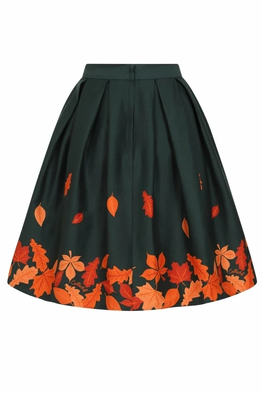 The Marilu Leaves Border Print Swing Skirt comes in a luscious, deep green, and features bespoke border print of lively, vibrant leaves in different shades of orange. Marilu is fitted at the waist and flared, falling approximately just below the knee for a dynamic and elegant silhouette. She features charming box pleat detail, and fastens with a centre-back zip. Pair with the Chrissie Plain Knitted Top in Orange for all the Autumn pinup perfection!