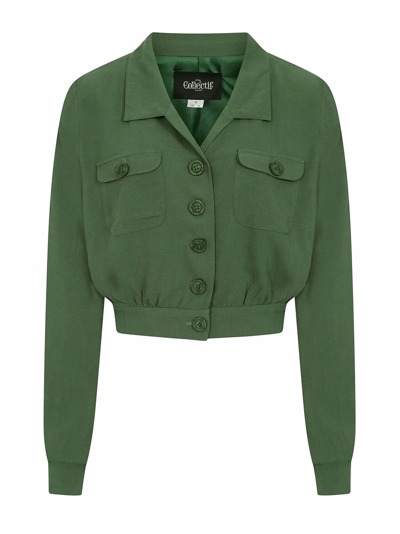 The Poppy Gab Jacket is perfect for layering up your outfit with some vintage flair! She’s a cropped style made from our gorgeous viscose fabric in a retro olive colour! She has a classic pointed collar, and her long sleeves have button-up cuffs. Her front is adorned with two patch pockets with flaps that fasten with two large green buttons. She fastens up at the front with large green buttons. Wear her with the matching Victoria Trousers for the perfect “Agent Carter” look!