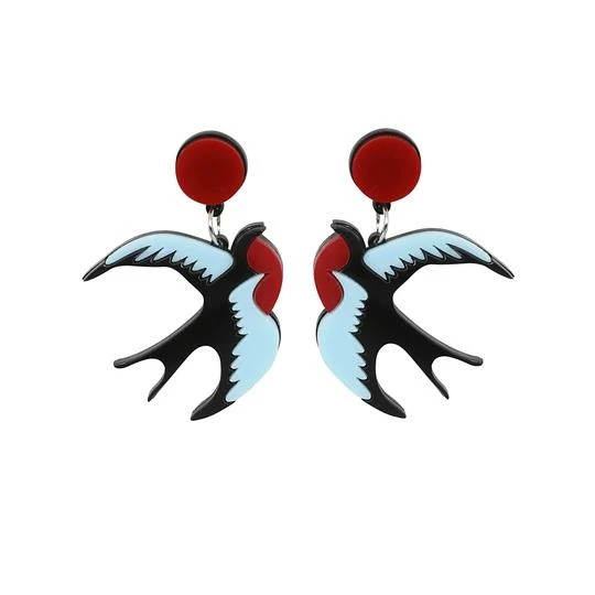 Add some badass to your look by popping on a pair of our Rockabilly Swallows Earrings! These acrylic swallows come in navy, baby blue and red and they dangle from a red round stud earring. Perfect with your trusty red bandana.