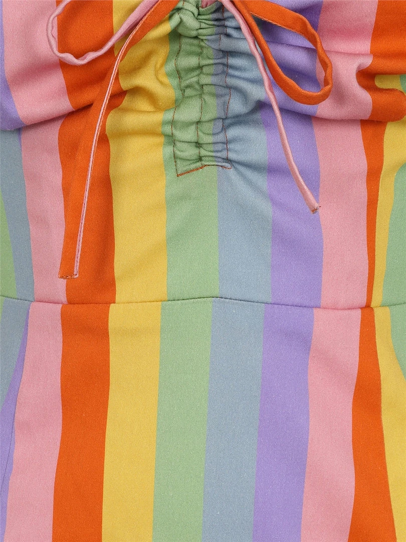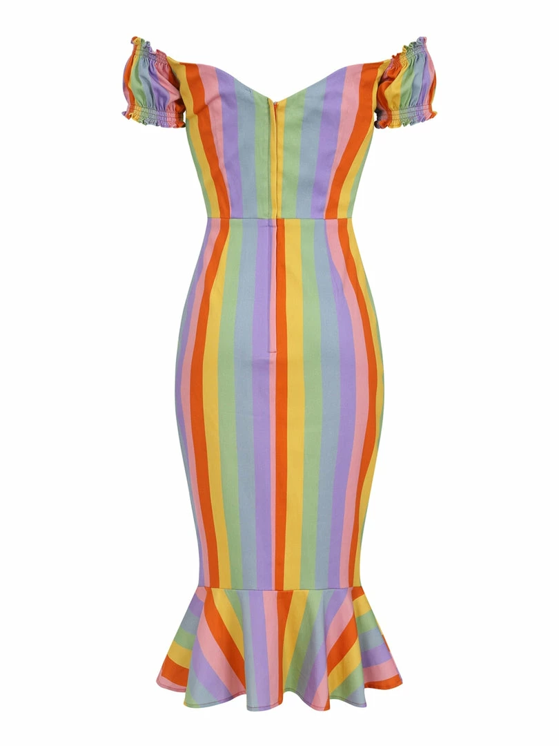 Let your love shine in our Sasha Vintage Rainbow Fishtail Dress. This stunning dress of many colours has a bardot style top with cute elasticated puff sleeves and a ruched sweetheart neckline. With her fishtail hem, she creates a spectacular, jaw-dropping silhouette of dreams.Â