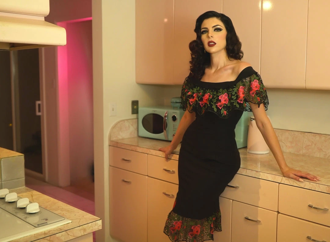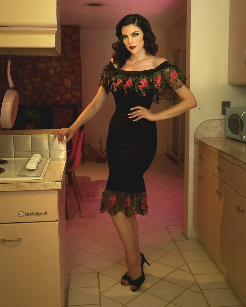 This beautiful stretch bengaline swing style off the shoulder Broadway dress is one to go down in the books and has pockets!! The stretch bengaline is a perfect fit to the body. Elastic on the shoulder allows the dress to give a perfect fit worn down or up. And the amazing colour of the roses on the black lace set around the top and bottom of the dress give it the most perfect pop ever.
