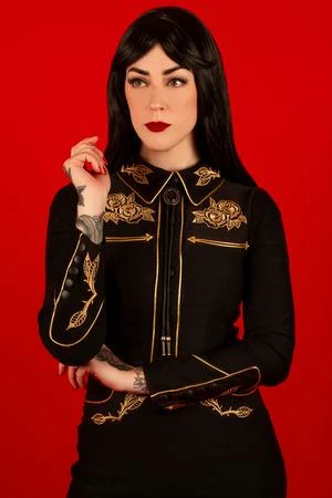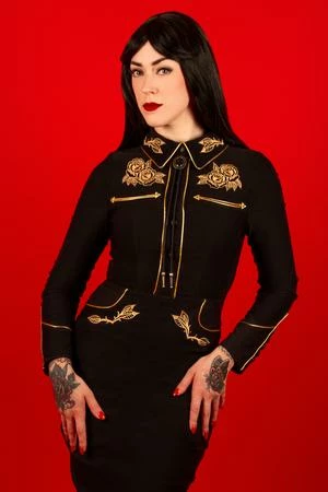 June Carter would swoon over her namesake dress. This stretch bengaline dress features stunning gold accents, long piped sleeves with faux snap cuffs. The front snaps are fixed to create a seamless look. Customized with rose and thorn embroidery on the collar, cuffs, bust, and hips, the pleather piping pulls the whole look together to create a truly striking Western wiggle dress.
