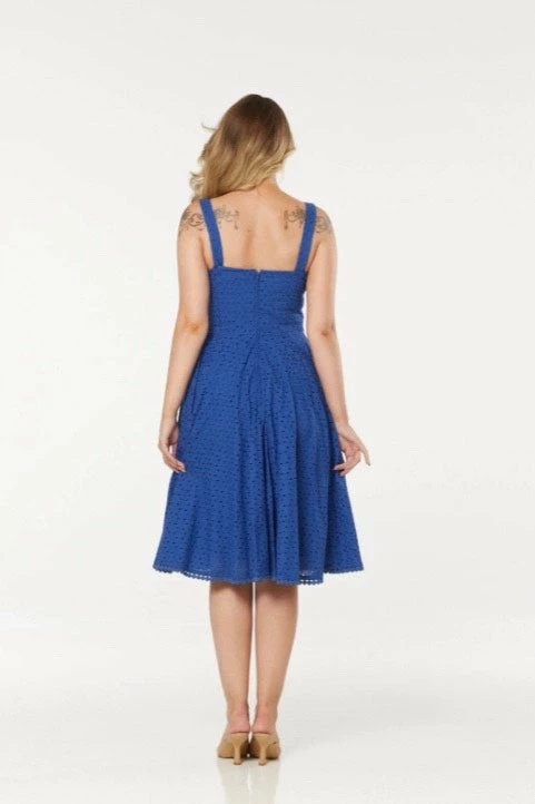 Alluring looks good on you, doll! The Valerie dress in broderie anglaise is a bewitching silhouette of cotton floral eyelet lace that’s perfect for a frolic through downtown. The soft sweetheart neckline features a gathered bust, supported by button adjustable straps while the wide banded waist elongates and slims your hourglass, complete with darling faux buttons to provide graceful vintage styling.