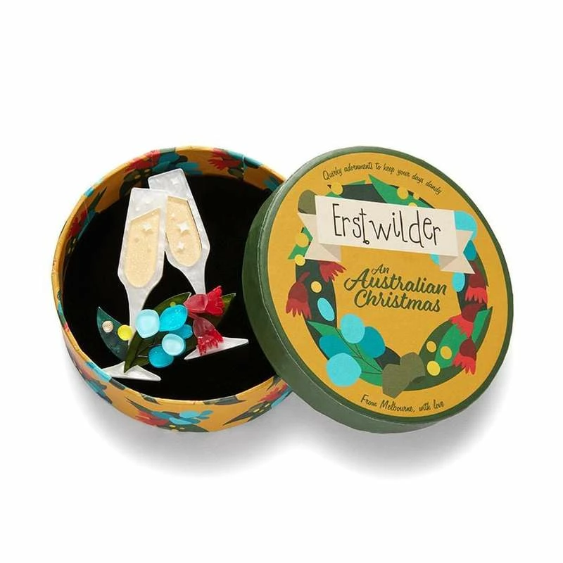 Hand-assembled from a sparkling selection of glitter textured resins, this champagne brooch has hand-painted details and is just what Saint Nick needs after a long night of delivering gifts.