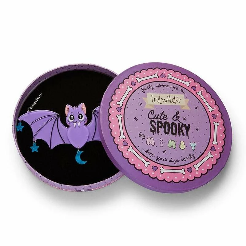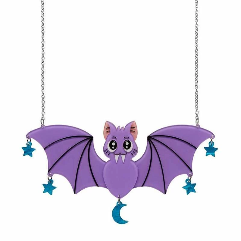 With bright and bold resins this beautiful batty necklace features hand-assembled details that will have you soaring into Halloween like vampire royalty, thanks to Erstwilder X Mimsy.