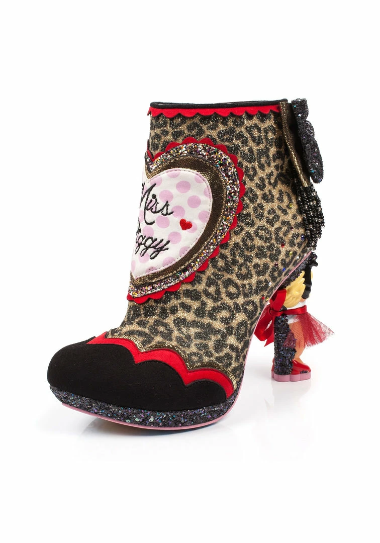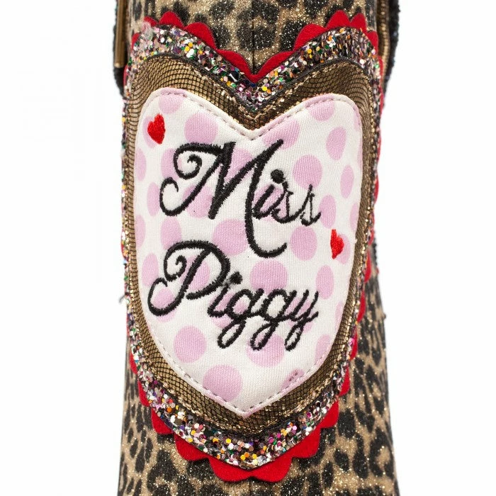 Looking fierce girl! These foot stomping vixen heeled boots are the ultimate ode to Miss Piggy. Featuring a leopard print upper, zipper fastening, large holographic bow embellishment, scallop detailing and a holographic glittery heart surrounding another heart with Miss Piggy embroidery. Finally we top of this gorgeous boot with our famous character heel of Miss Piggy with a real fabric skirt.