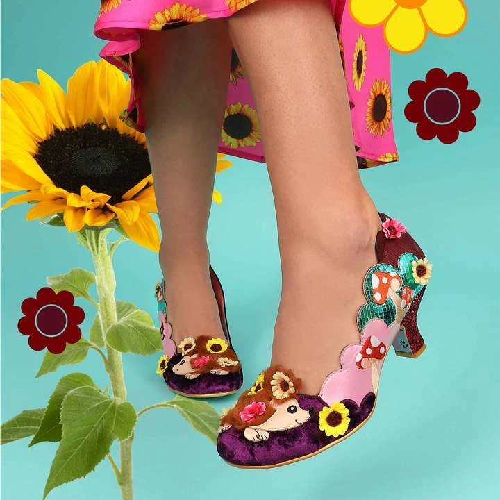 Have a magical adventure in the hedgerows with gorgeous posies, enchanting mushrooms and a little hedgehog friend! A wearable low heel is encrusted in fuchsia glitter for that extra bit of sparkle, accenting the turquoise and pink tones of the upper! Perfect to bring a smile to anyone’s face!