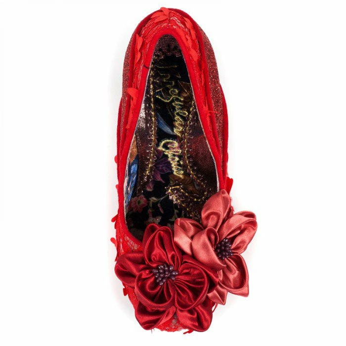 A fairytale floral princess dream with a vixen edge, these dreamy high heels will put a spring in your step this season. Featuring a red glitter heel and detail on the upper with a lace floral main upper and two beautiful silk flowers on the toe.