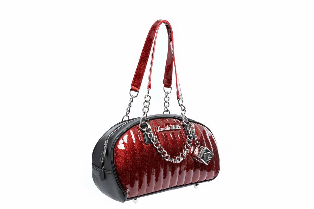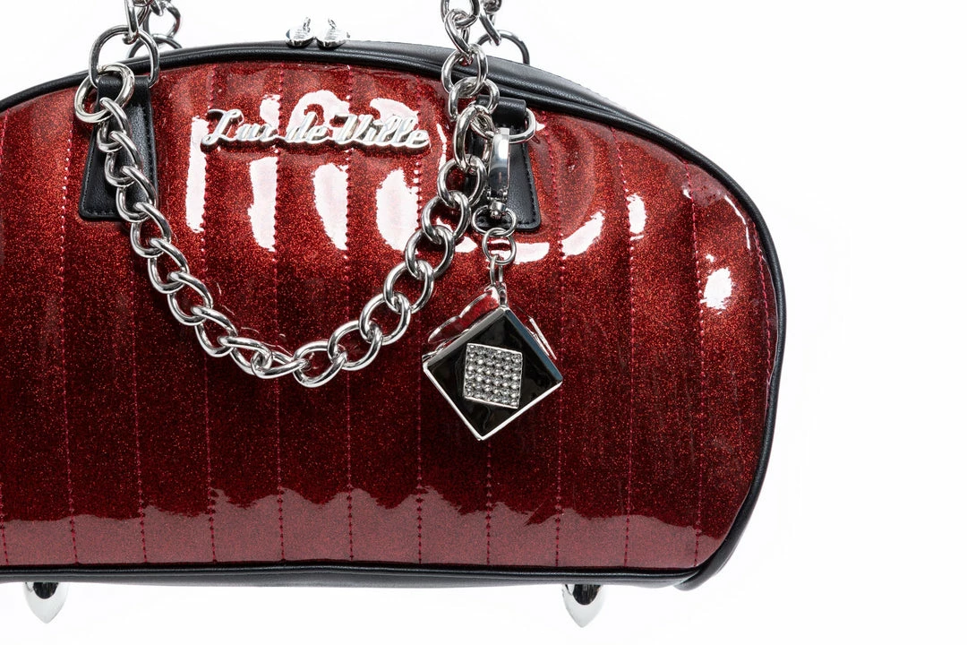 Featuring tuck and roll stitching, chain details, and a giant detachable rhinestone dice bauble.