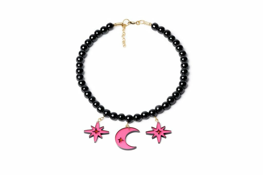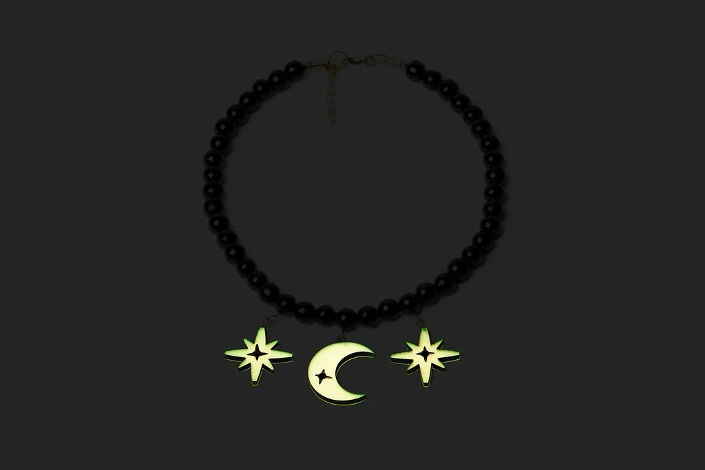 Halloween season is here! And what would Halloween be without a little red and black? The Blood Moon Necklace is a classic spooky combo with a very exciting twist! Yup…this collection glows in the dark!! Charge it up in the light, complete your favourite vintage style outfit and give everyone a spooky surprise!