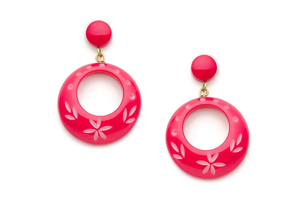 Bursting with colour, the Raspberry Carved Drop Hoop Earrings are a beautiful addition to your pinktastic 1950s outfit. The delicate petal carvings mixed with the vibrant berry colour means Raspberry is ideal for both fruity and floral accessorising, or keep it simple with its ice-cream parlour pal, Ripple, for a scrumptious vintage style combo.