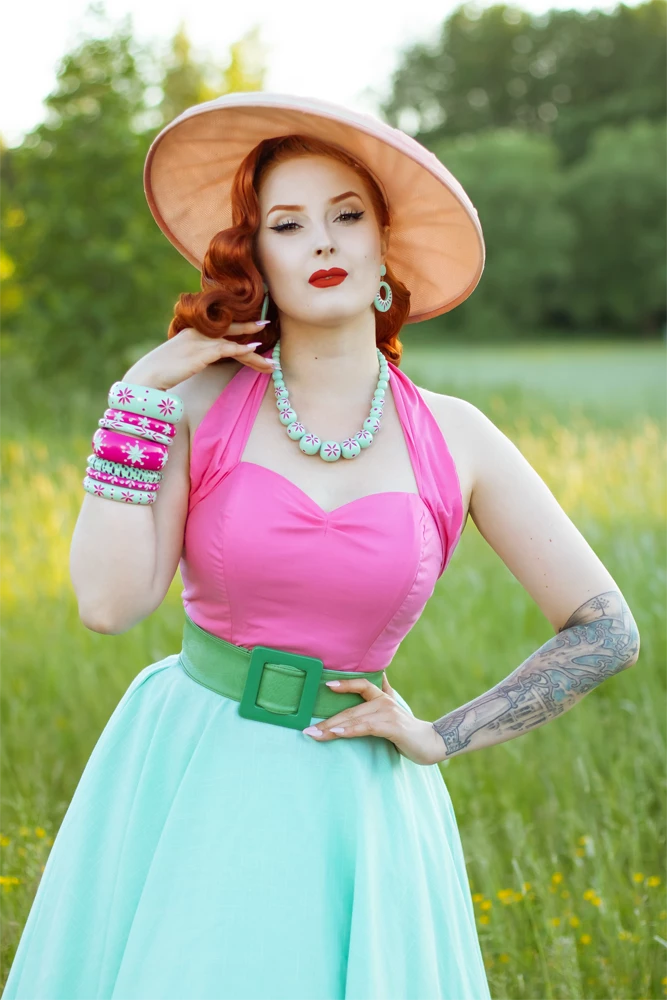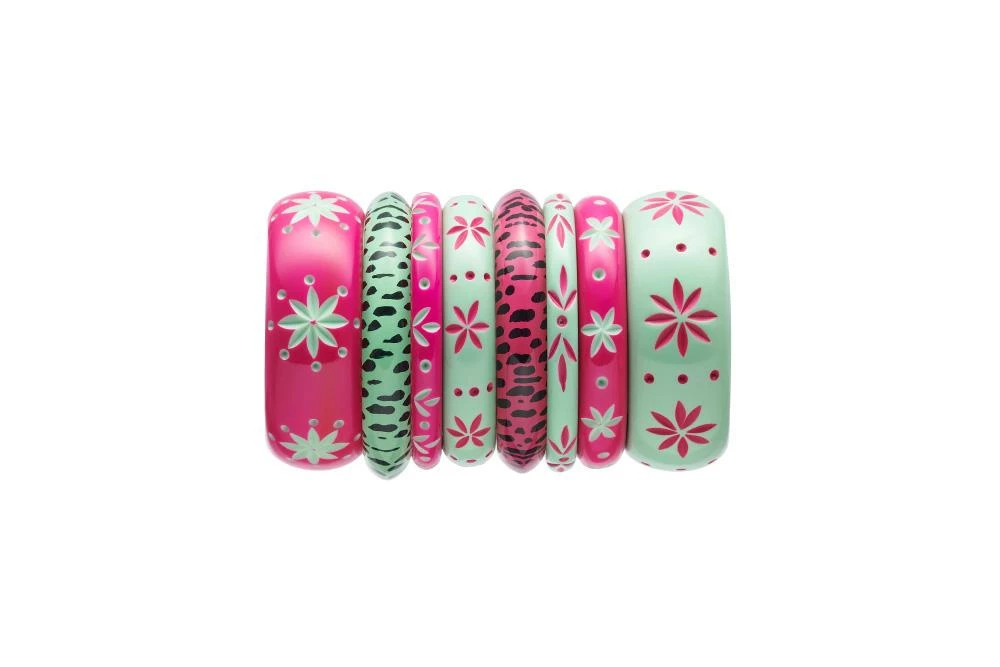 Flamingo has got us in a right flap! It doesn’t get more kitschy vintage inspired than Flamingo. Take them from your tropical paradise front lawn and adorn your wrist with a stack of fakelite fabulousness Duotone bright pink with mint green carving.