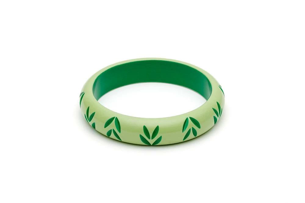 Feel fresh and fancy with our Midi Spring Carved Bangle adorning your wrist. A luscious light green with vivid green carvings create a dreamy Duotone combination perfect for any and all vintage lovers.