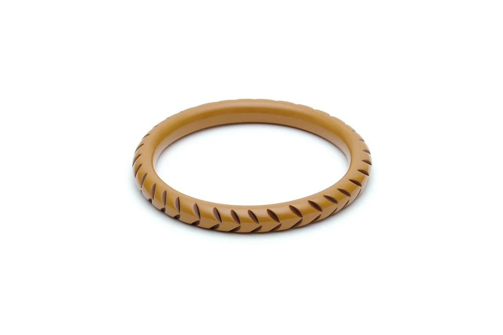 The perfect mixture of tropical vibes meets vintage western wear. Whether you’re a 1940s cowgirl on the ranch or a 1950s beach-side babe, Narrow Almond is the ideal addition to your fakelite bangle stack.