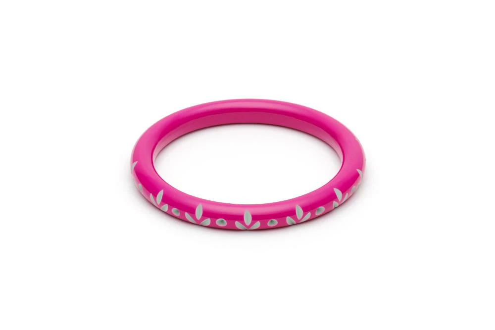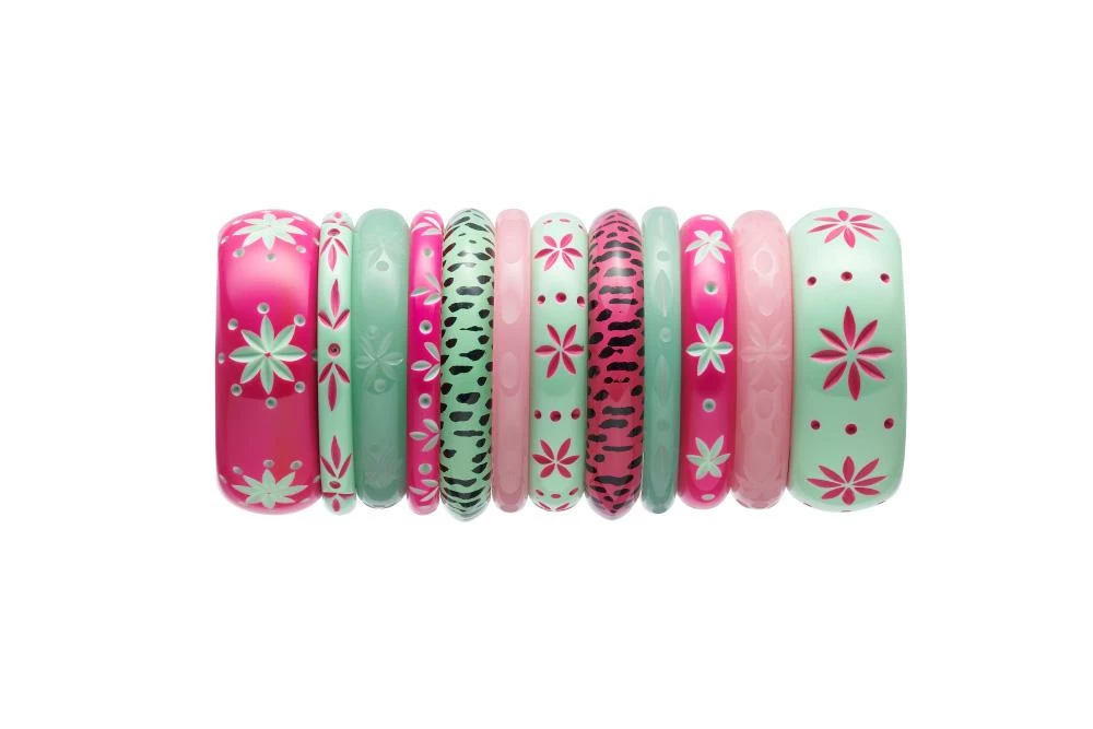 Flamingo has got us in a right flap! It doesn’t get more kitschy vintage inspired than Flamingo. Take them from your tropical paradise front lawn and adorn your wrist with a stack of fakelite fabulousness Duotone bright pink with mint green carving.
