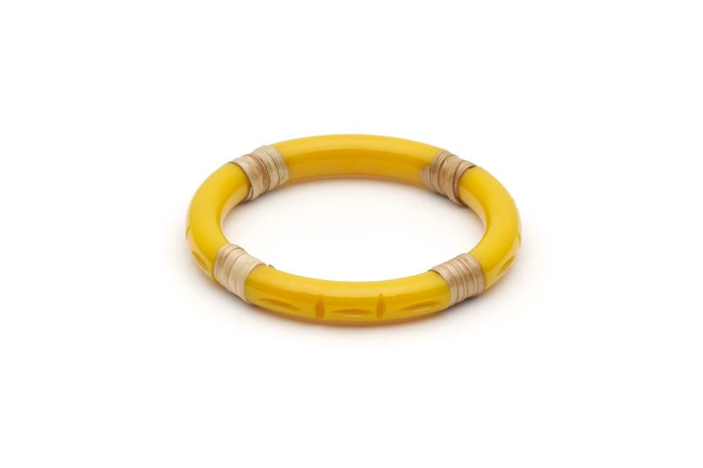 Ochre is a warm, earthy and rich yellow inspired by the tropical colours we see in vintage clothing, jewellery and homeware from the 1940s and 1950s. The fakelite Narrow Ochre Cane Bangle is available in three cane colour variants….decisions, decisions!