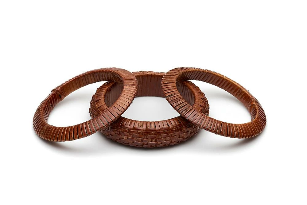 These woven bangles are the perfect spacers to break up a stack or worn by themselves to add a touch of the tropics to your outfit.