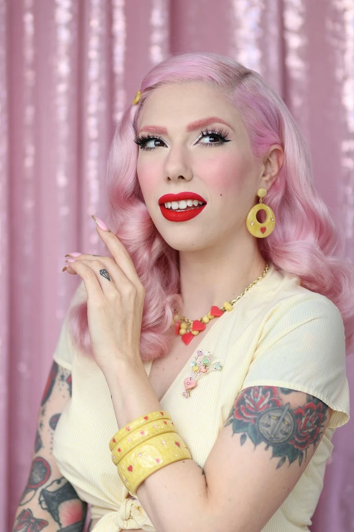 We are buzzin’ about this colour! A gloriously sunshiney yellow, the Extra Wide Honey Bunch Starburst Bangle has 1950s style carvings and pink hearts for a kitsch kick.