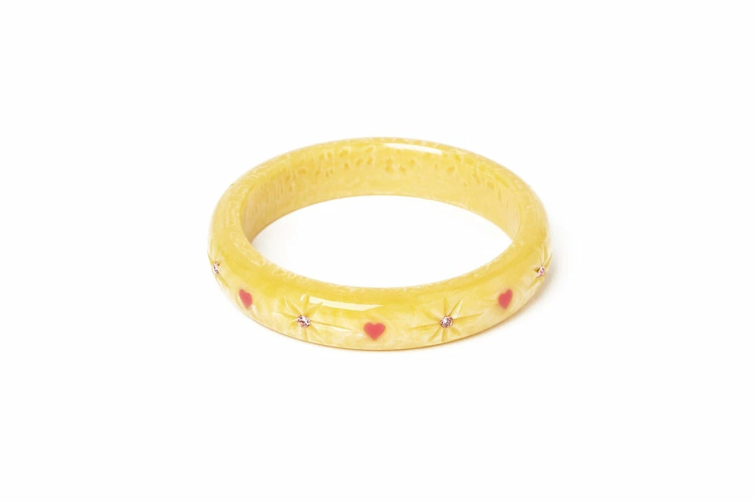 We are buzzin’ about this colour! A gloriously sunshiney yellow, the Midi Honey Bunch Starburst Bangle has 1950s style carvings and pink hearts for a kitsch kick.