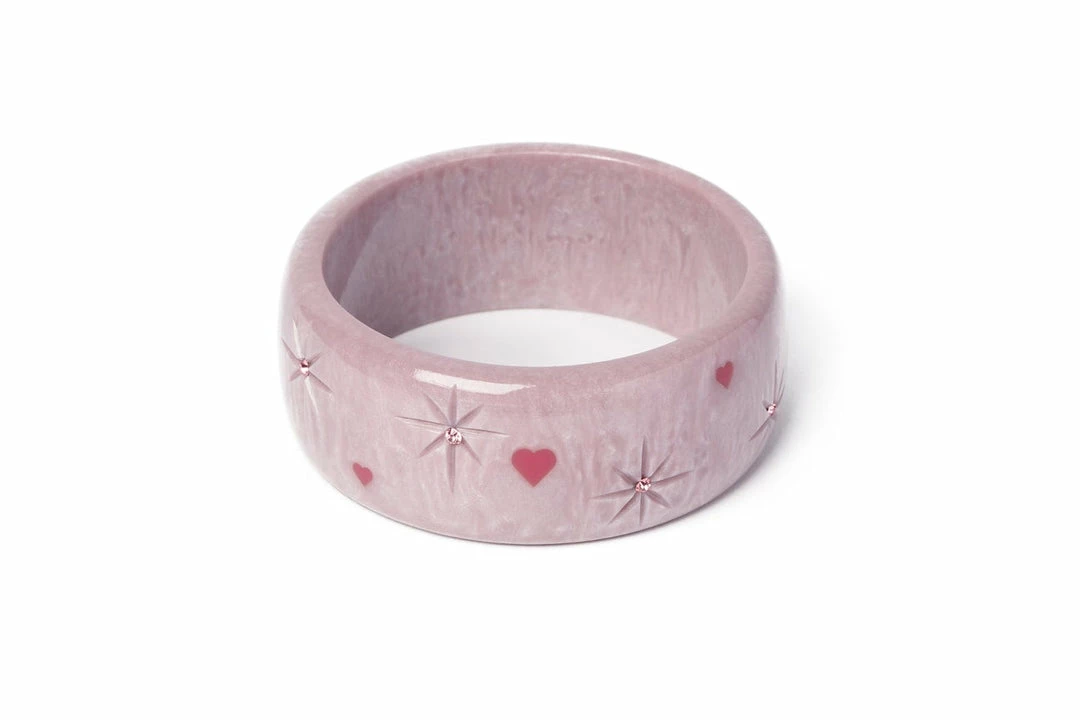 Pastel purple and perfect for pin ups at Valentine’s! The Extra Wide Poppet Starburst Bangle will gets heart a’fluttering with its 1950s inspired carvings and pink heart inlays.