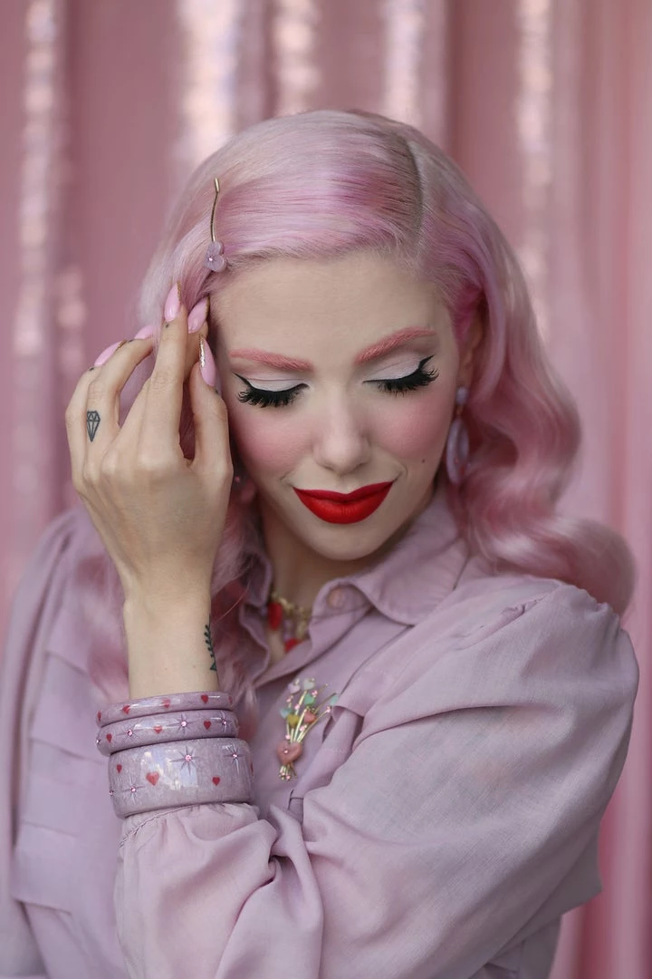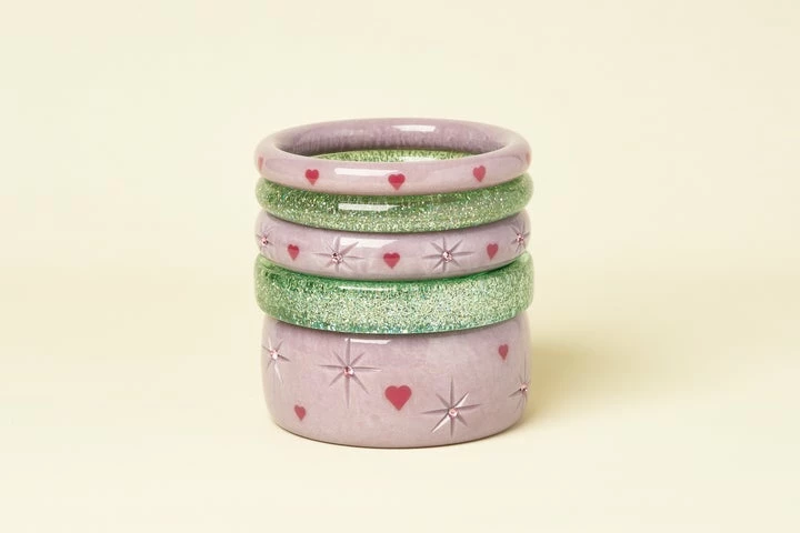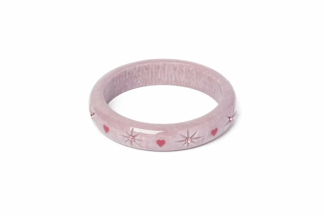 Pastel purple and perfect for pin ups at Valentine’s! The Midi Poppet Starburst Bangle will gets heart a’fluttering with its 1950s inspired carvings and pink heart inlays.