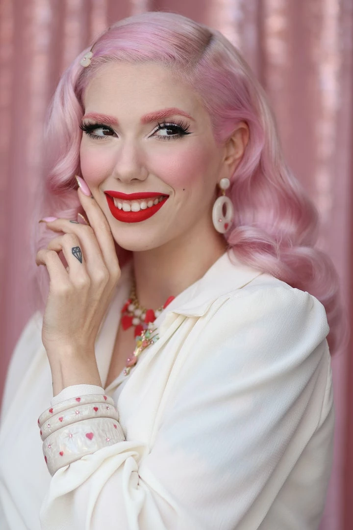 Super sweet and equally cute, the white Extra Wide Sugar Starburst Bangle with cute pink hearts and 1950s inspired starburst carvings is perfect for vintage lovers!