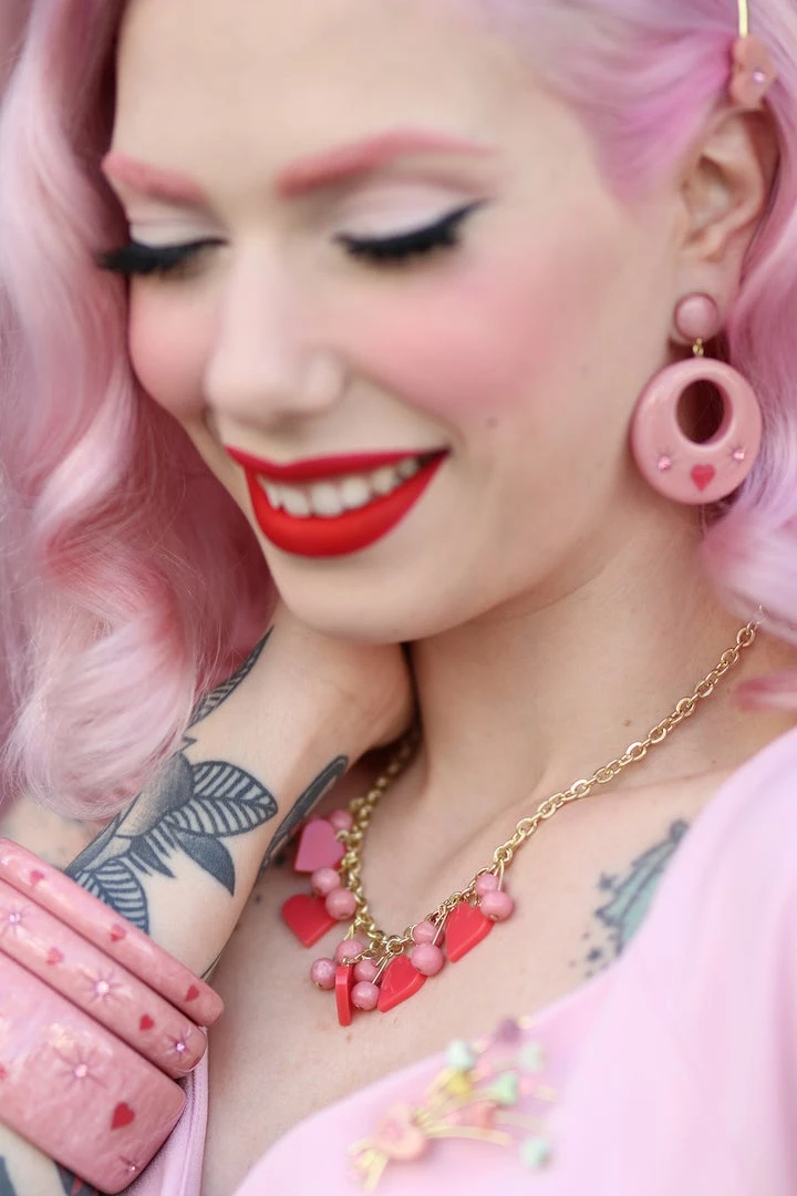 The gorgeous pink Sweet Cheeks Heart Necklace is perfect for keeping your vintage inspired Valentine’s outfit sweet!