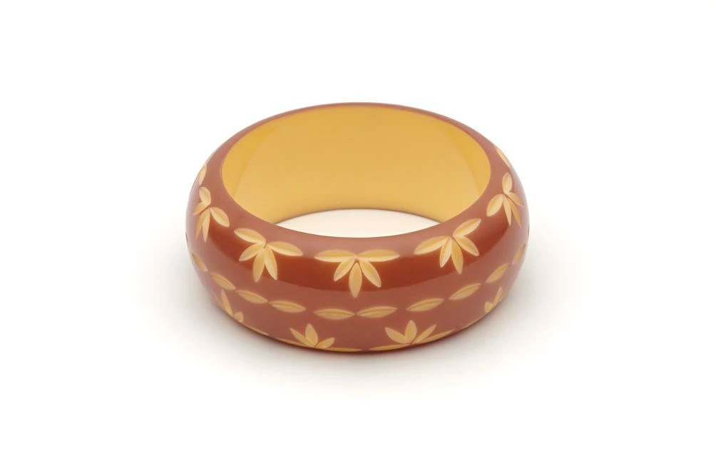 Deliciously vintage inspired, the Wide Café Carved Bangle is a new edition to the Duotone collection to perk up your stack. Inspired by the popular Western styles of the 1940s, we love stacking Café with its (howdy) partner Lait, and a dash of Jade, for the perfect “riding off into the sunset” fakelite stack.
