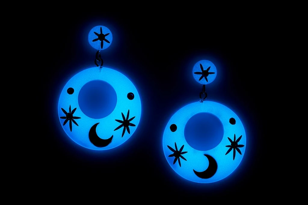 The Wolf Moon Drop Hoop Earrings are a supernatural blue with black moon and starburst details to give these earrings a retro Halloween twist. And it gets better! This entire Halloween collection glows in the dark! Charge up the jewellery and glow get ’em, ghouls!