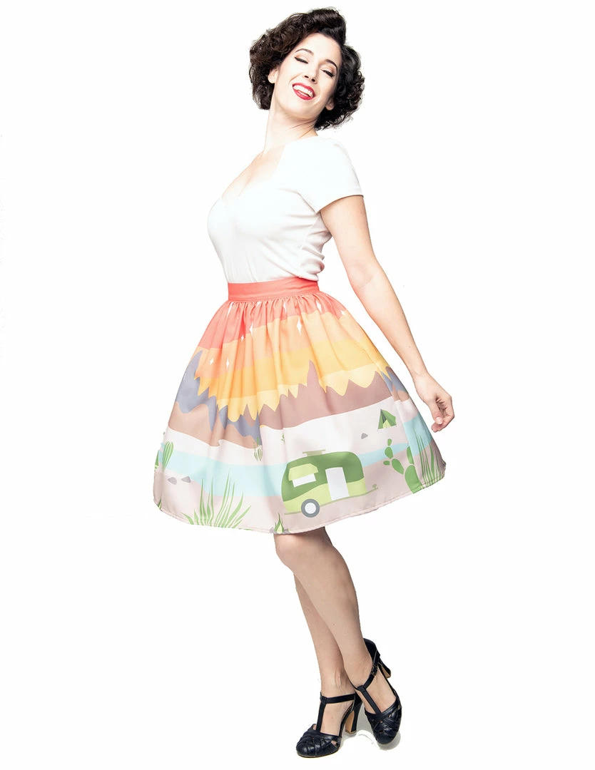 Get ready to hit the road and blaze new trails in this vintage camper and desert scene print skirt! Â