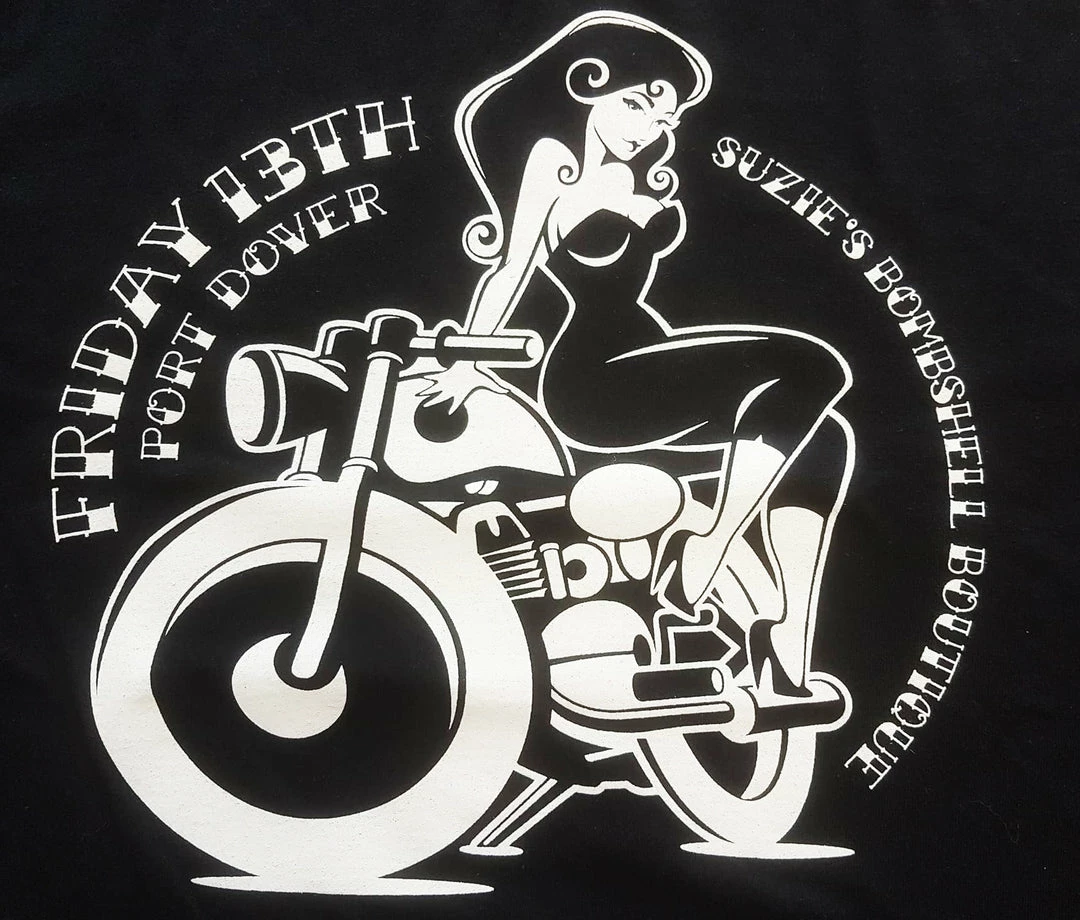 Get your biker girl on in Suzie’s Bombshell Boutique’s very own Friday the 13th logo tee!