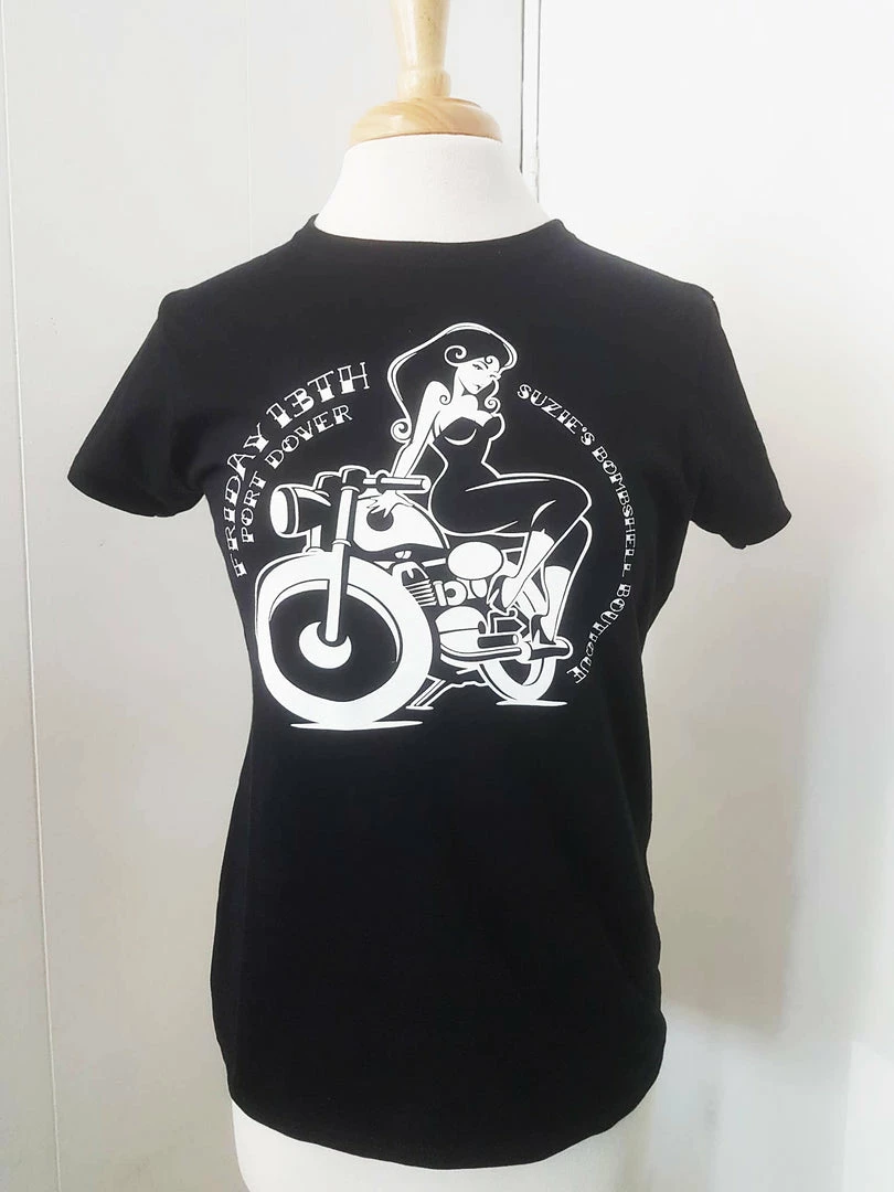 Get your biker girl on in Suzie’s Bombshell Boutique’s very own Friday the 13th logo tee!