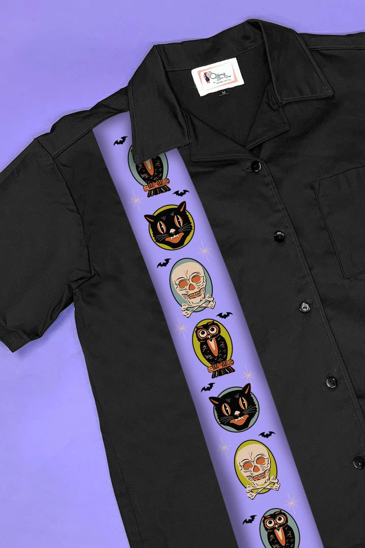 Black cotton button down shirt with a printed panel featuring the custom art of an owl, cat and skull.