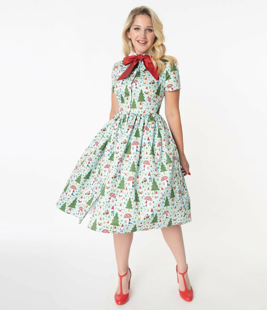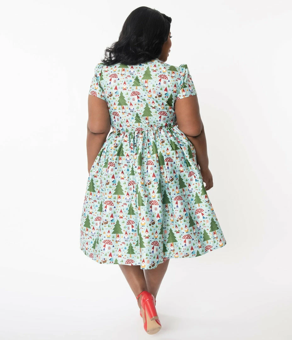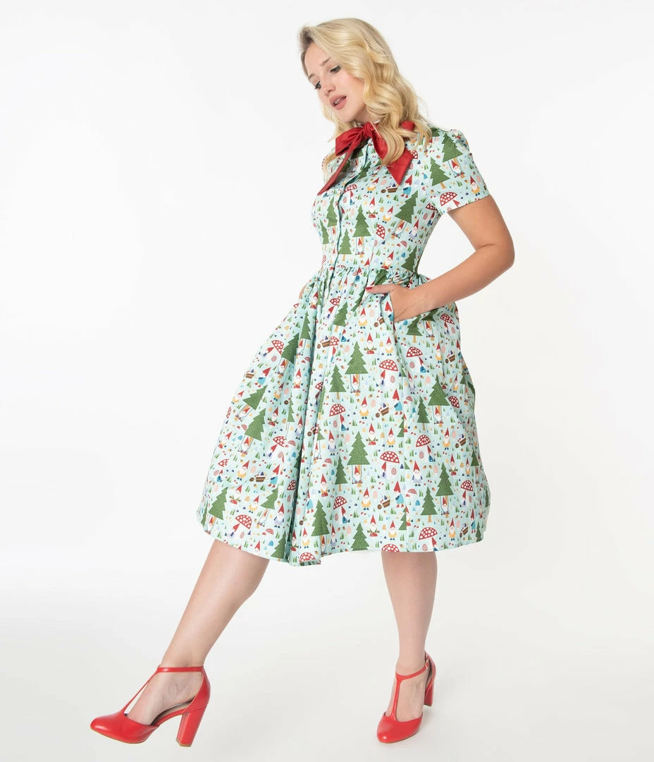 There’s gnome one else for you, darling! A vintage vixen’s dream in a chic mint blue with an adorable print of forest gnomes and mushrooms, this adorable mid-century piece from Unique Vintage is a captivating silhouette with it’s sturdy fabric. The marvelous button-up design is highlighted with sweet short sleeves, darted bodice, gathered yoke, and a fantastic self-tie neck scarf in red to center your ensemble. Seamed at the waist, the gathered circle skirt drops to a straight hemline at the knees while hidden side pockets keep your enchanted treasures close at hand. Fabulous forest frolics!