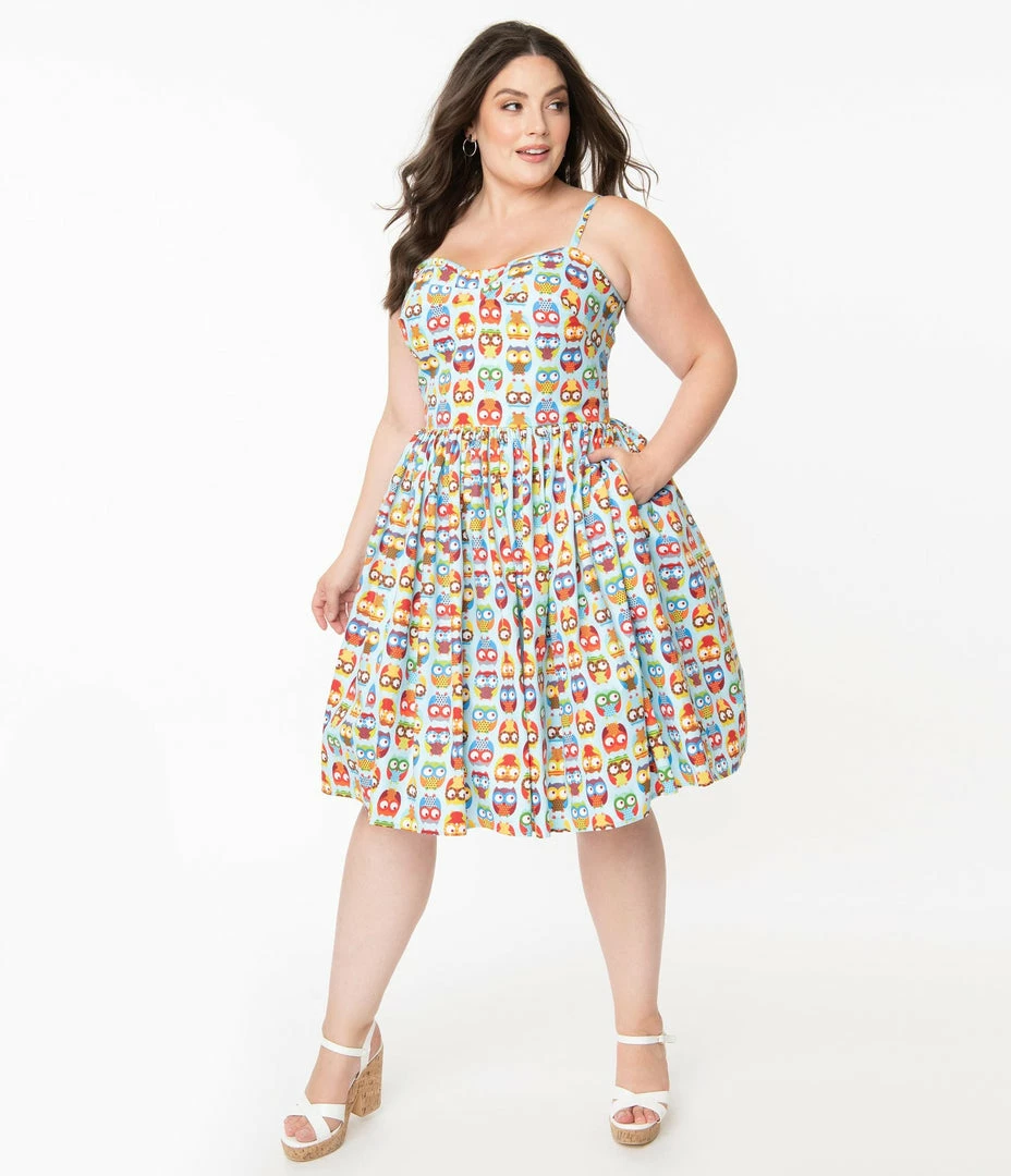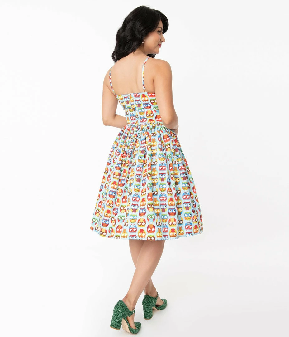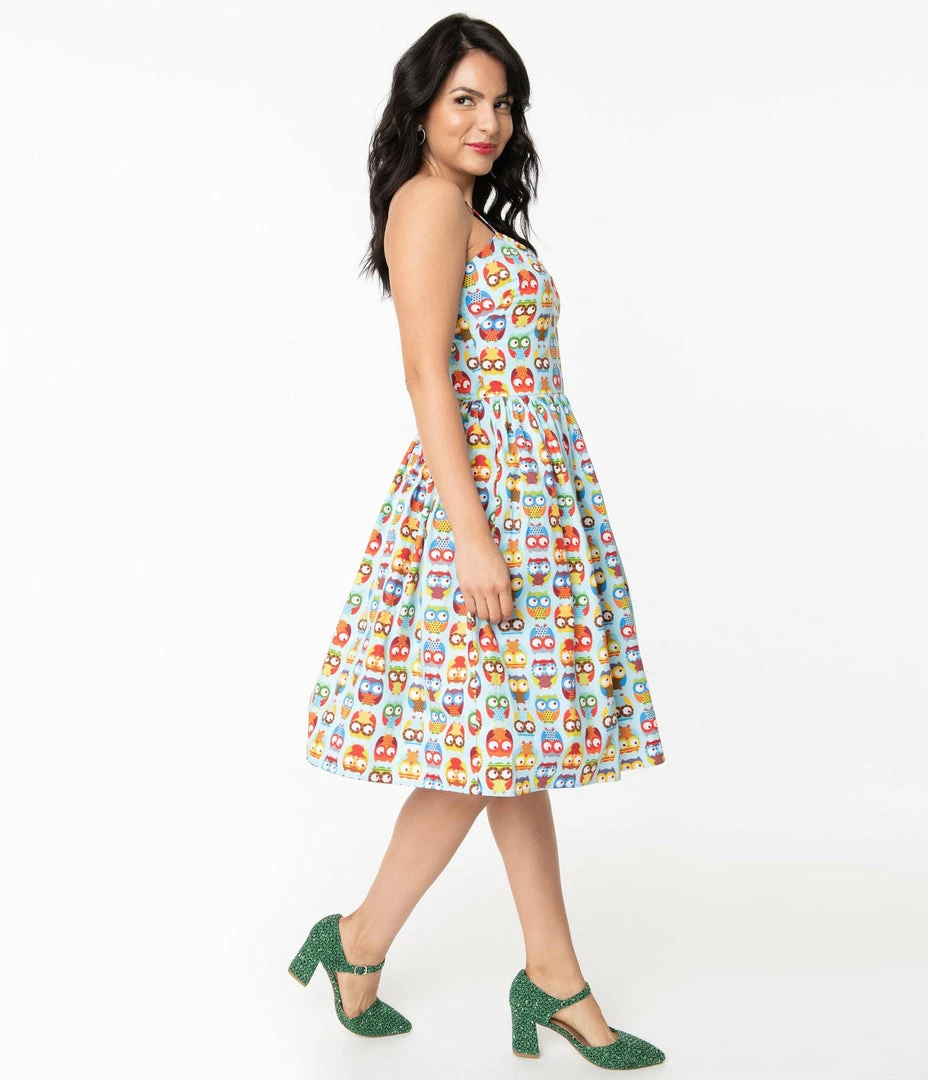 Darcy has us in a tizzy, darling! Utterly divine in an adorable print of multicolor retro owls set against a light blue woven fabric, the Darcy Dress from Unique Vintage is a vintage swing that’s bursting with radiant detail. Crafted in a woven blend with adjustable straps that support a darted bodice, while the back zipper is structured to hug your form in the most flattering way. A full circle swing skirt is unlined and lightweight, with hidden side seam pockets and enough room for a petticoat pop!