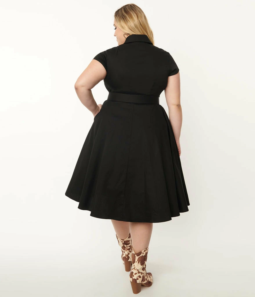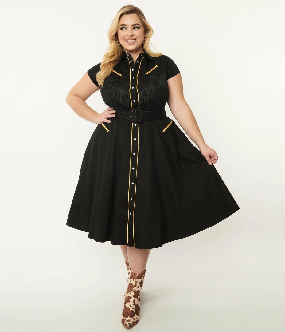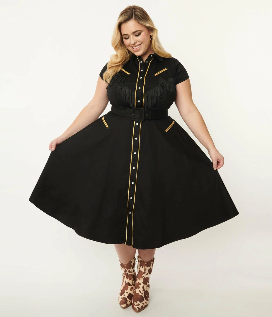A western inspired swing dress crafted in a sturdy blend set in solid black with golden accents. The snap button up front is cinched with a belt while the swing skirt is outfitted with side pockets. Complete with black fringe and faux golden pocket appliqués.