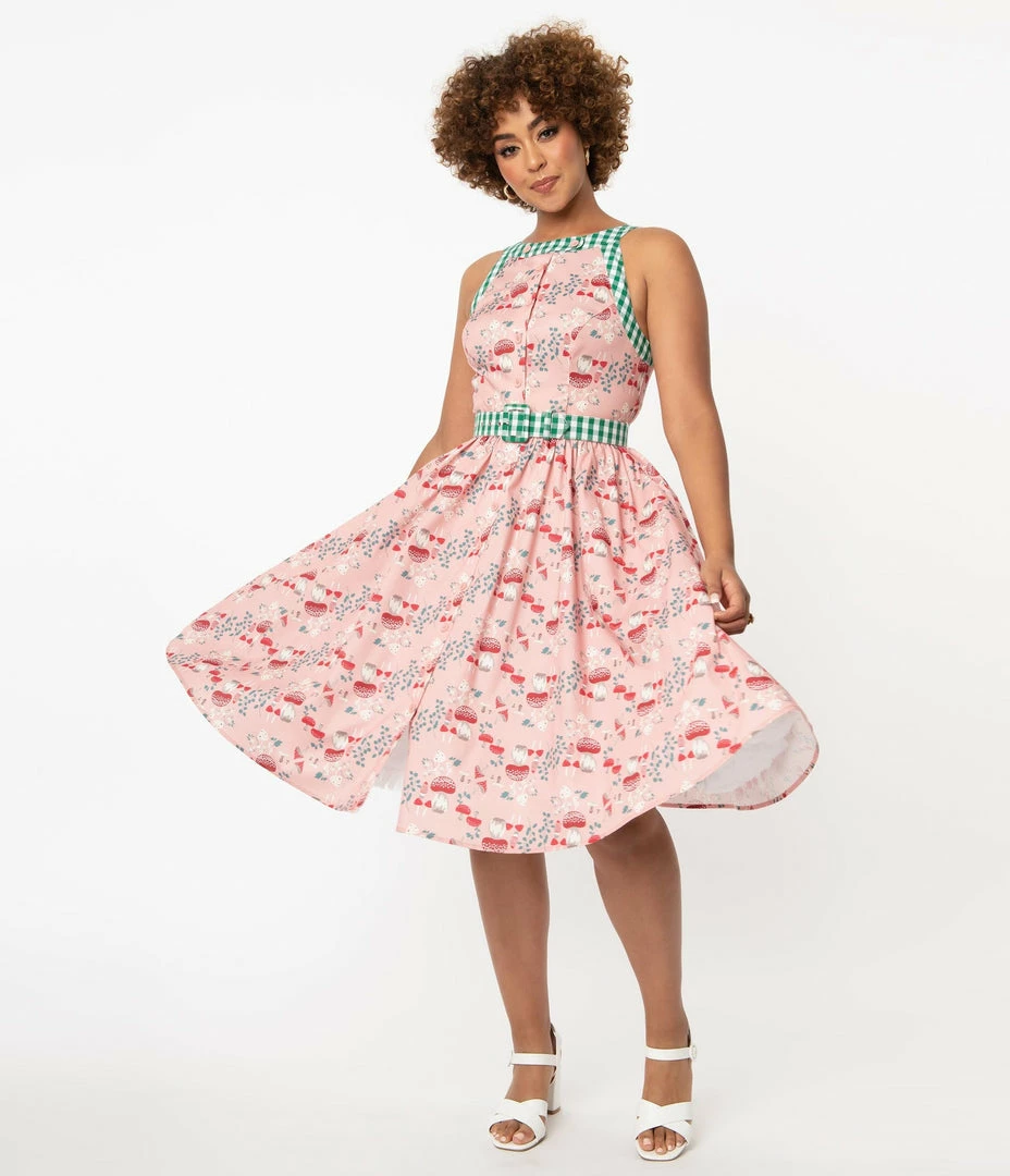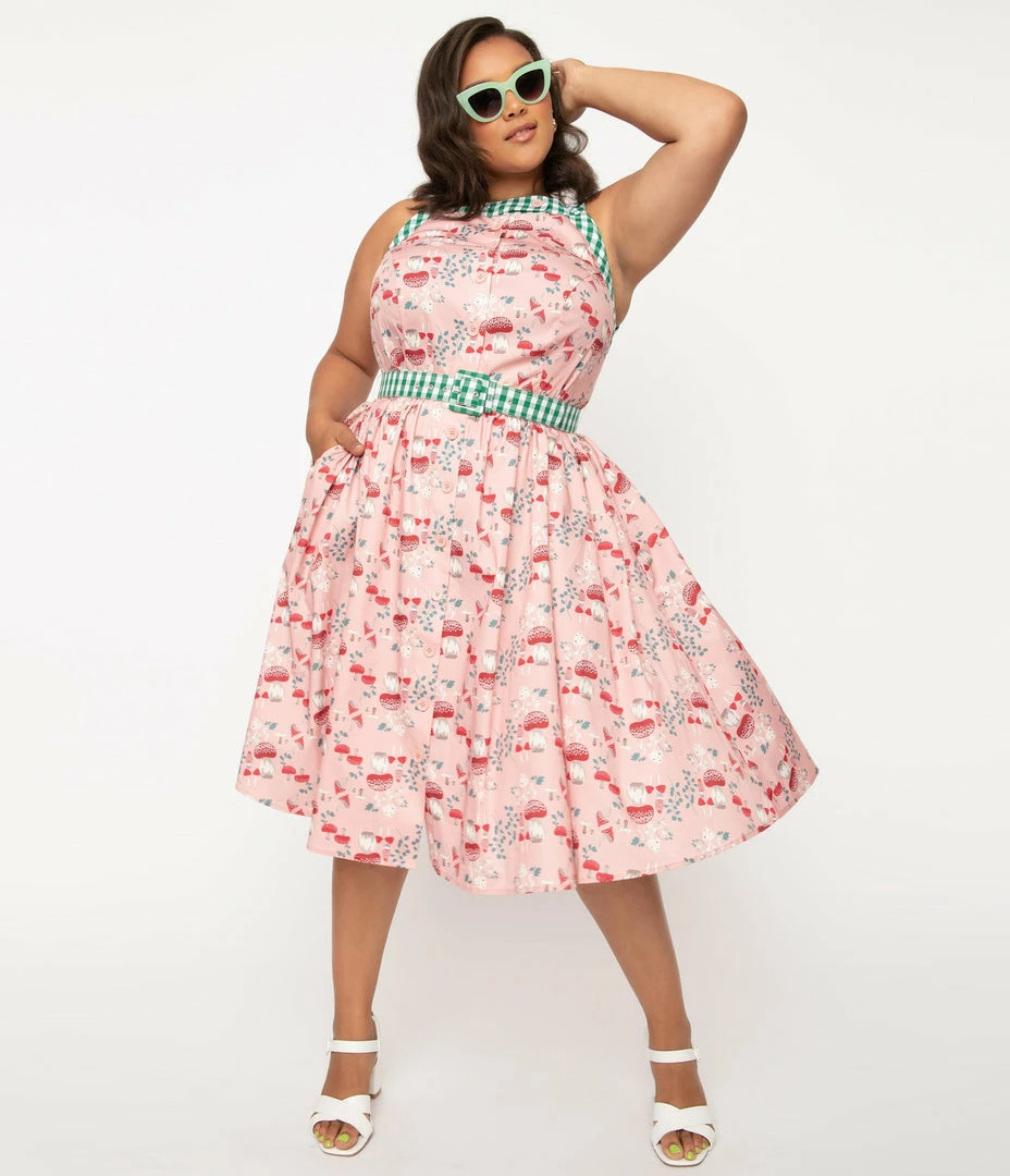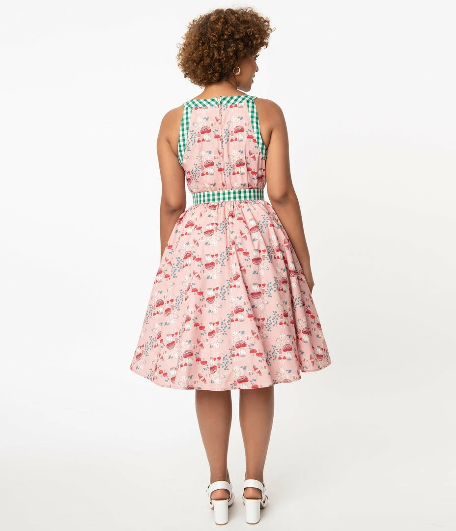 Everyone is entitled to your opinion, darling! A vibrant mid-century inspired piece from Unique Vintage, the Maxine Dress is a daydream with marvelous mushrooms printed throughout the woven rose pink backdrop. The princess seamed bodice is embellished with a green gingham neckline and sultry open shoulders while faux buttons provide a retro accent. The seamed waist can be cinched with a green gingham belt as the gathered skirt is outfitted with side pockets for modern function, Complete with a back zipper, unleash your thoughts on the world!