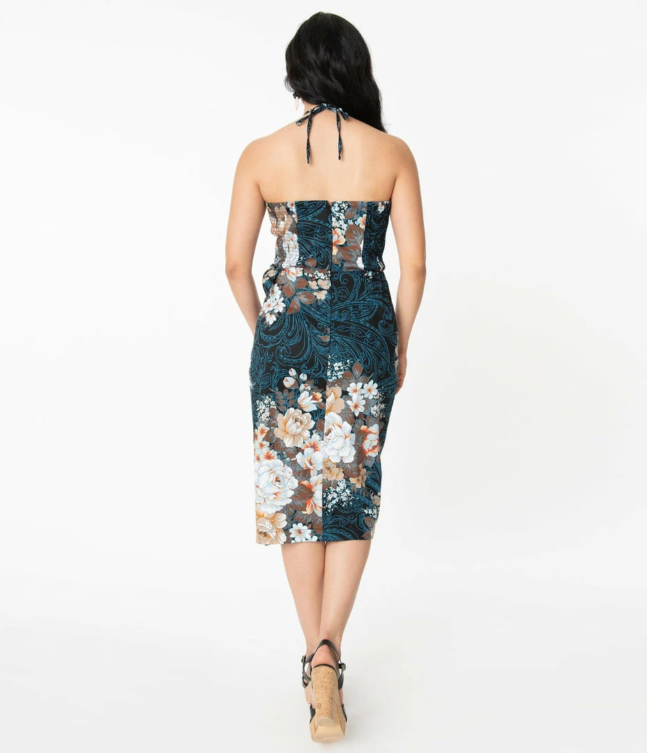 We’ve got a date for an exclusive party, dears! A ravishing frock from Unique Vintage, this floral dream features a striking sarong silhouette in a lightweight cotton. The sumptuous white, blue, and brown florals cascade through a navy blue and black print backdrop. The sweetheart bodice is subtly boned for additional support while smocked sides and a wide banded waist slim and elongate with fitted perfection. Attached spaghetti straps in the front allow for either a halter display or a dainty bow tie in the front as a lovely fitted skirt features a partial wrap design with a self tie at the hip for more pin-up styling while the straight hem past the knees provides a vintage silhouette. Complete with a back zipper to nip in your form!