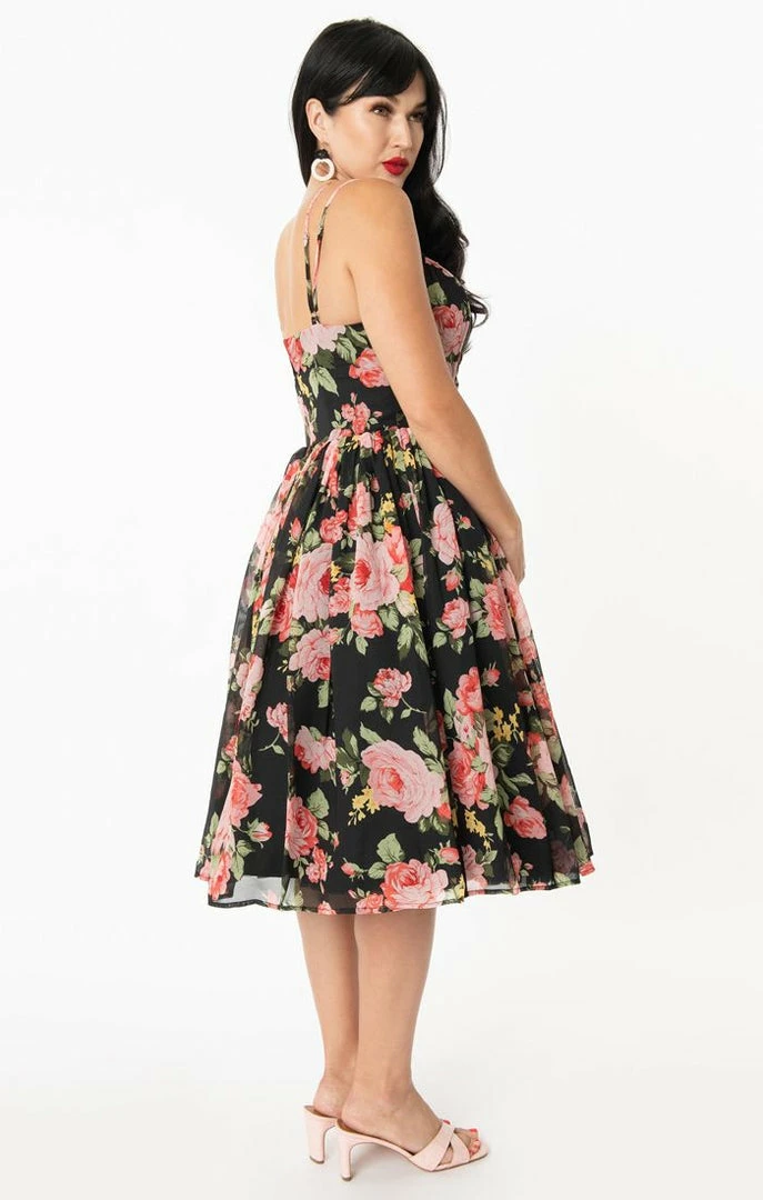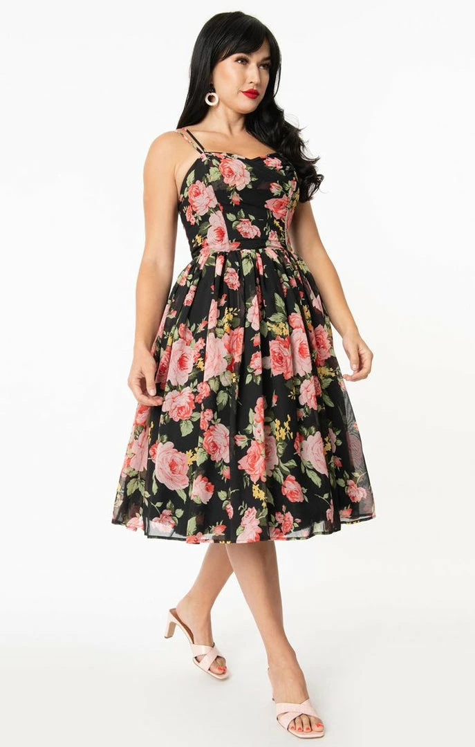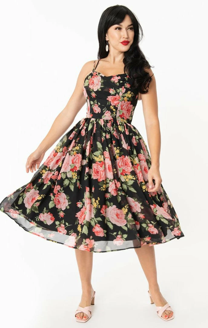 The grace of quiet confidence, darling! This dreamy mid-century inspired piece from Unique Vintage is crafted in a lightweight black, chiffon style fabric that dances with pink roses throughout. The sweetheart bodice is secured with adjustable spaghetti straps and keeps form with front and back boning while the seamed waist is cinched with a back zipper. The gathered swing skirt cascades to your knees while full lining lends comfort for all day wear!